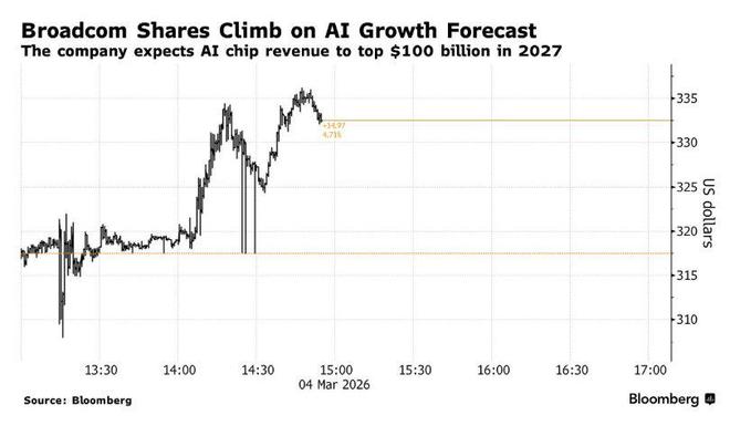 智通财经APP获悉,全球AI热潮最大赢家之一博通(AVGO.US)北京时间3月5日晨间公布截至2月1日的2026财年第一季度财报数据以及第二季度业绩指引展望。整体而言,博通最新公布的业绩数据以及管理层对于下一财季的最新展望均超出华尔街分析师预期,尤其是1000亿美元AI芯片营收前景进一步验证了华尔街所高呼的“AI热潮仍然处于算力基础设施供不应求的早期建设阶段”,以及凸显出随着AI推理时代到来,在云端AI推理算力需求激增以及聚焦将AI大模型嵌入企业经营的“微训练”趋势之下,性价比更高AIASIC算力系统对于英伟达近乎90%市场份额的AI芯片垄断地位发起强有力冲击。