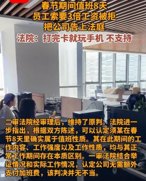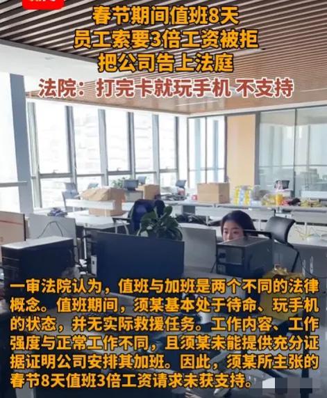 江苏,一男子春节留守公司值班8天,本想着能拿3倍工资,结果收假后老板死活不发,说男子只是待命没实际维修,不算加班。这样算下来的损失就有6240元,男子多次索要无果,直接起诉了公司,可法院最终的判决却引发了不小的热议! 这事儿是江苏无锡一个真实的案子。男子姓须,在一家销售公司当机电维修工。2024年春节,公司安排他从大年初一到初八,连着八天在单位守着。他心里盘算,这可是法定节假日,按规矩得给三倍工资。 八天下来,他每天准时打卡,在单位待着。可怪就怪在,整整八天,一个报修电话都没响过。他大部分时间就是刷刷手机,看看视频,纯粹是“待命”状态。节后找老板要那6240块钱的加班费,老板两手一摊:你这叫值班,不叫加班,哪来的三倍工资? 两边谈不拢,只能法庭上见。一审法院没支持须师傅。理由很简单,法院认为“值班”和“加班”是两码事。须师傅自己也承认,那八天没干任何实质性的维修活,工作强度跟平时上班完全没法比。他就是在那儿以防万一,属于保障性质的值班。 须师傅不服,又上诉到无锡中院。二审法官分析了三个层面,第一看工作目的,加班是为了赶生产任务,值班是为了应对突发情况,保障安全。第二看工作内容,加班得干本职活儿,值班可能就接接电话、巡视一下。第三也是最关键的,看工作强度。加班忙得脚不沾地,值班通常能休息。 须师傅这八天,自己都说基本在玩手机,工作强度极低。所以二审法院维持原判,公司不用额外支付那300%的加班费。判决书一下来,网上就炸锅了。 很多人替须师傅叫屈。春节假期,谁不想回家团圆?人家牺牲了和家人团聚的时间,老老实实在单位守着,就算没活干,那也是付出了时间,限制了自由。凭什么就不算加班?一句“值班”就把三倍工资抹了,感觉像是钻了空子。 也有人觉得法院判得在理。加班费补偿的是超额劳动。如果只是待在单位玩手机,也能拿三倍工资,那对真正忙碌的加班者太不公平。企业安排人值守,是为了防范风险,这种“待命”状态,本来就不该和紧张忙碌的“加班”画等号。 这件事说到底,是“值班”和“加班”的边界问题。法律保护劳动者的超额劳动,但也不支持不劳而获。对于劳动者来说,如果节假日被安排工作,最好提前问清楚这算值班还是加班?待遇怎么算?有没有书面通知?如果实际干了很多活,却只给一点值班费,那就要注意保留工作记录,方便日后维权。 对于企业,安排值班可以,但别玩文字游戏。把明明需要干活的安排说成值班,克扣员工应得的报酬,迟早会引发纠纷,败坏名声。规矩立在明处,大家心里都踏实。 春节值守,无论叫值班还是加班,都有一份默默的付出在里面。怎么合理认定这份付出的价值,需要法律更清晰的指引,也需要企业和劳动者之间更多的理解和诚信。 各位读者你们怎么看?欢迎在评论区讨论。