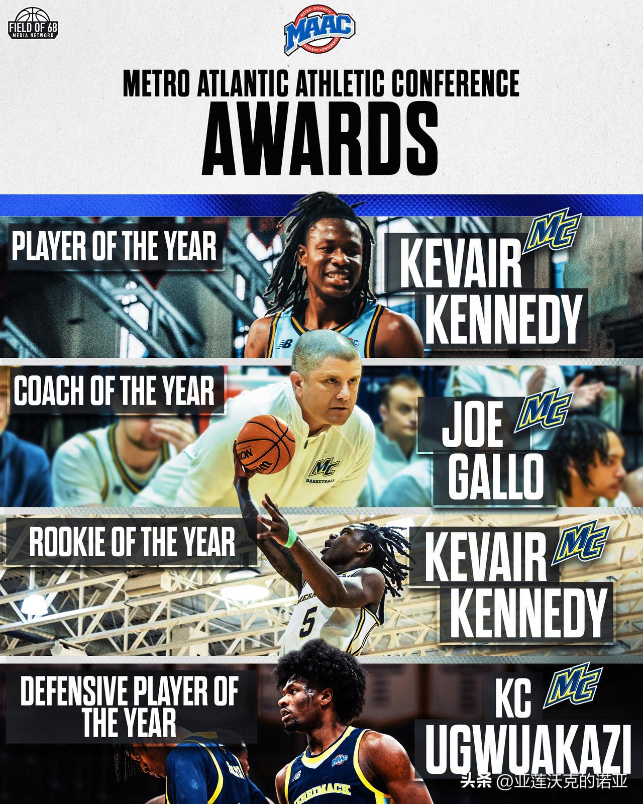 控卫Kevair Kennedy包揽MAAC联盟年度最佳球员和最佳新人,MAAC联盟46年以来首位同时赢得这两项殊荣的球员,最佳防守球员是KC Ugwuakazi,最佳教练是Joe Gallo,他在短短七个赛季将梅里马克Merrimack从二级联盟球队带到MAAC联盟常规赛冠军,正在追逐首次疯狂三月之旅。