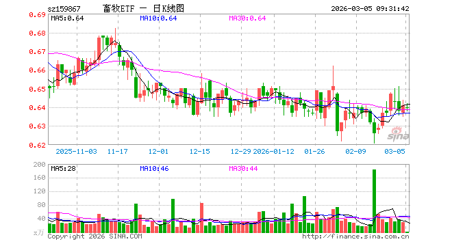 3月5日,畜牧ETF(159867)开盘跌0.16%,报0.640元。畜牧ETF(159867)重仓股方面,牧原股份开盘涨0.00%,海大集团跌0.02%,温氏股份涨0.06%,正邦科技涨0.31%,新希望跌0.23%,梅花生物涨0.63%,生物股份涨0.87%,大北农跌3.17%,圣农发展跌0.26%,立华股份涨0.77%。