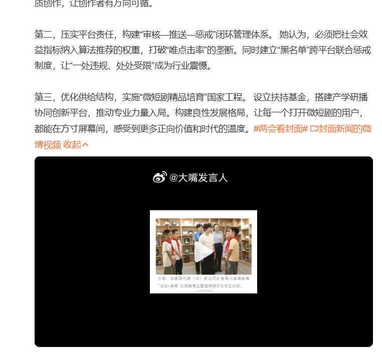 人大代表反问微短剧爽完之后呢 要允许普通民众,在八小时工作学习之外,把其它时间全部用于娱乐等非工作学习内容不是每个人,都要在业余时间用来学习、思考爽看短剧,看完一部,再接着看下一部呀建议对微短剧乱象亮红灯,热点观点