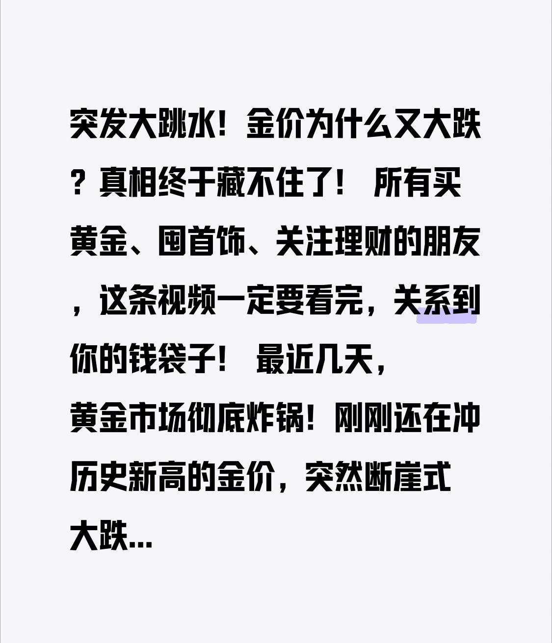 突发大跳水!金价为什么又大跌?真相终于藏不住了! 所有买黄金、囤首饰、关注理财的朋友,这条视频一定要看完,关系到你的钱袋子! 最近几天,黄金市场彻底炸锅!刚刚还在冲历史新高的金价,突然断崖式大跌,国内金价一天跌掉几十块,国际金价更是单日暴跌超5%,无数人懵了:昨天还抢着买,今天怎么就突然崩了? 很多人以为是中东不打仗了、避险需求没了,其实没这么简单!这波大跌,是四大原因一起砸盘,普通人根本扛不住! 真正的转折点来了! 第一,避险情绪快速退潮。前几天因为中东紧张,大家疯狂买黄金避险;现在局势阶段性缓和,资金立刻撤离,避险溢价直接清零。 第二,美元强势反弹。美国通胀数据超预期,市场彻底推翻美联储降息预期,美元大涨,黄金直接被压制。 第三,高位获利盘砸盘。黄金这波涨了快30%,机构、大户全都在高位套现落袋为安,集中抛售引发踩踏。 第四,杠杆资金爆仓。很多人加杠杆炒黄金,一跌就被强制平仓,越跌越卖,形成恶性循环。 说白了,不是黄金不行了,是之前涨太猛,现在该回调了。涨得有多疯狂,跌得就有多刺激。 这下全网吵翻了:有人慌着割肉,有人趁机抄底。其实大家买黄金,无非是想保值、安心、给家人一份保障。 但我必须提醒你:黄金短期看情绪,长期看价值。大跌不是末日,暴涨也不是永远。别追高,别恐慌,别加杠杆,普通人少炒短线,长期拿着才踏实。 别被涨跌绑架,理财是为了生活,不是为了心跳。 看懂金价涨跌逻辑,才能守住自己的血汗钱!