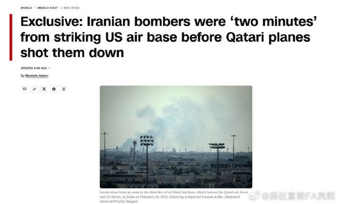 美国有线电视新闻网报道,两架伊朗苏-24战术轰炸机在距离美军在中东最大的军事基地——乌代德空军基地仅数分钟航程时,被卡塔尔战斗机在其首次空战任务中击落。 这两架轰炸机距离目标仅两分钟航程,并低空飞行以躲避雷达探测。在发出警告但未收到回应后,卡塔尔将这两架飞机列为敌机并派出战斗机。 一架卡塔尔F-15战斗机与敌机交战并将其击落,飞机坠入卡塔尔领海。目前仍在搜寻机组人员。
