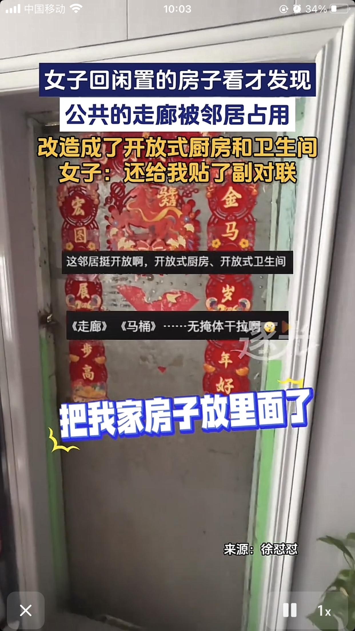 占过道的我见过不少,但这么离谱的占过道我还是头一次见。起因是内蒙古一网友要去自己闲置的房子里看一下,可没想到刚到走廊就被前面的场景吓了一跳。邻居直接把公共区域改造成了一居室,不仅有开放式厨房,还有开放式卫生间,甚至还“热心”的给网友家门上贴了一副对联。 只能说这邻居一家实在太开放了,一点都不把网友当作外人,我都不敢想网友一开门就看见一个人在上厕所,另一个人在做饭,那场面爽酸。