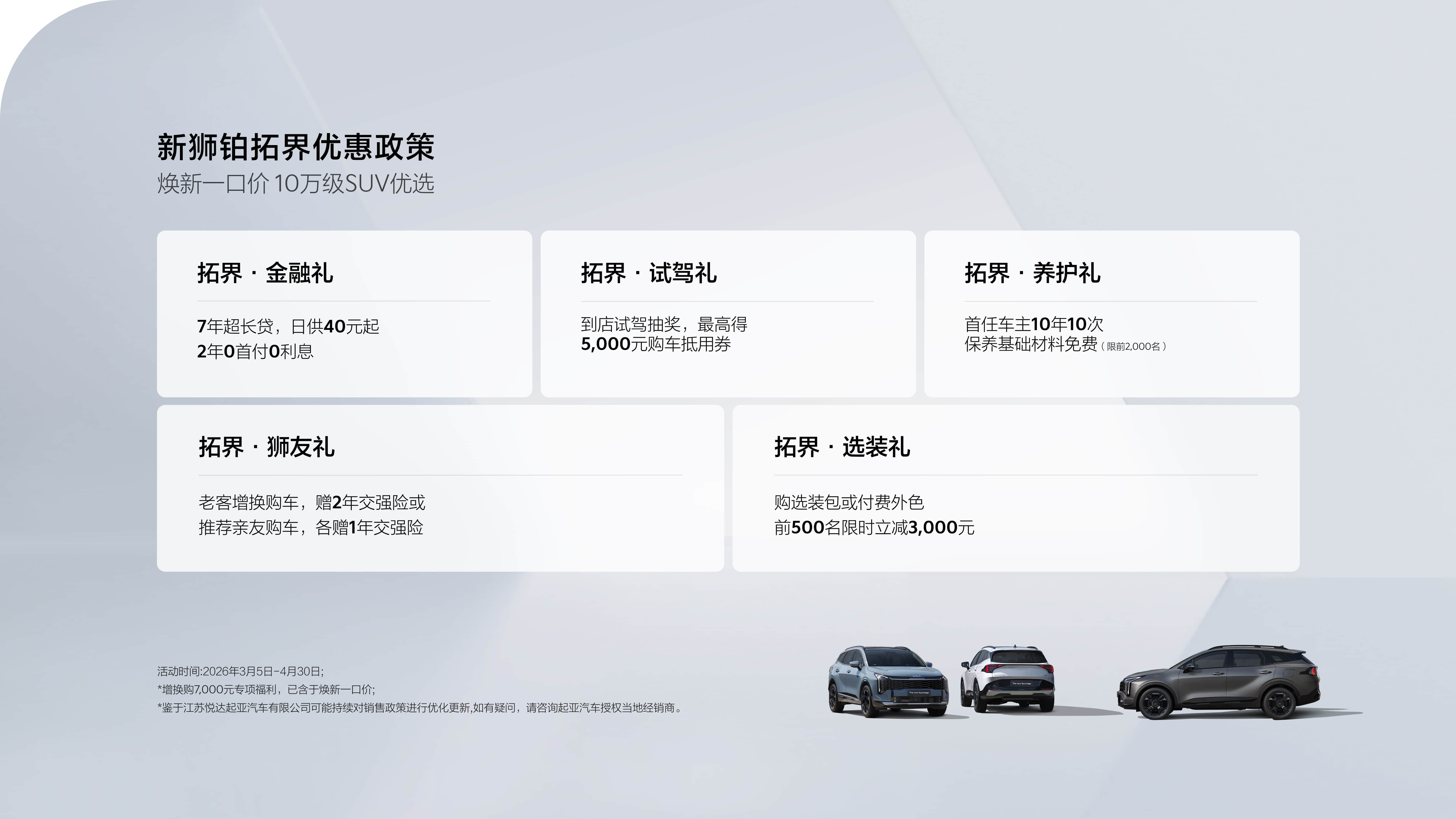 【起亚狮铂拓界推“全国一口价”,10.99万起李娜姜山认定的家用SUV 】起亚中国正式官宣狮铂拓界(Kia Sportage)全系车型实施全国统一一口价政策核心配置: ✅ 动力组合:1.5T/2.0T发动机 + 8AT变速箱,1.5T输出200马力,2.0T达245马力,WLTC油耗低至7L/100km; ✅ 全系标配L2级智能驾驶:含全速自适应巡航、车道居中、AEB主动刹车; ✅ 空间体验:4695mm车长 + 2755mm轴距,后排可调靠背+纯平地板,空间媲美中型SUV; ✅ 座舱:双12.3英寸联屏 + CCNC智能车机,支持CarPlay/CarLife、语音控制、OTA升级; ✅ 安全:基于第三代i-GMP平台打造,高强度钢占比超50%,标配6气囊+全域防护车身结构。