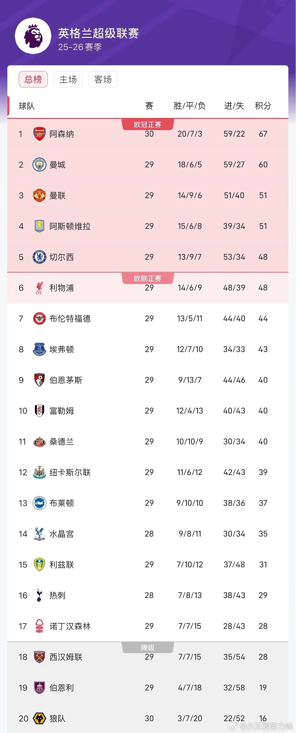 在最新的积分榜中,阿森纳多赛一场积67分,领先第二名的曼城7分,曼联积51分排在第三位,4-6名分别是维拉、切尔西和利物浦。
