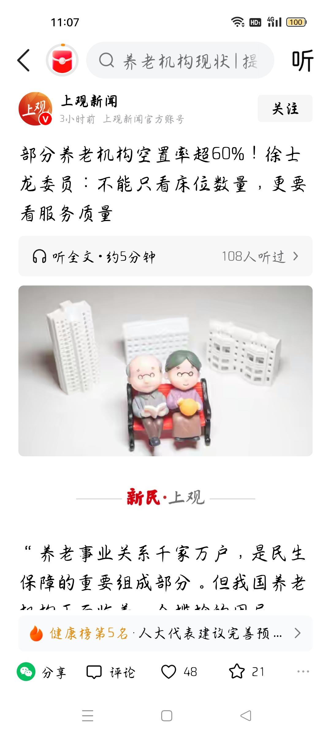 部分养老机构空置率超60%,我想说 据上观新闻报道,部分养老机构空置率超60%,政协委员徐士龙说,养老不仅看数量,还要看服务质量,我国养老机构面临这样困局:想住的人进不去,有空床的没人来。有些养老机构空置率超60%,为什么会出现这样的困局?个人认为,首先传统上还是以家庭养老为主,这种观念根深蒂固。其次部分养老机构没有来,个人认为有以下原因一是收费高,其次服务质量有待于提高。中国有许多老人,未来老人越来越多,需要转变观念,提高服务质量。相关老人的养老会越来越好。各位条友觉得呢?
