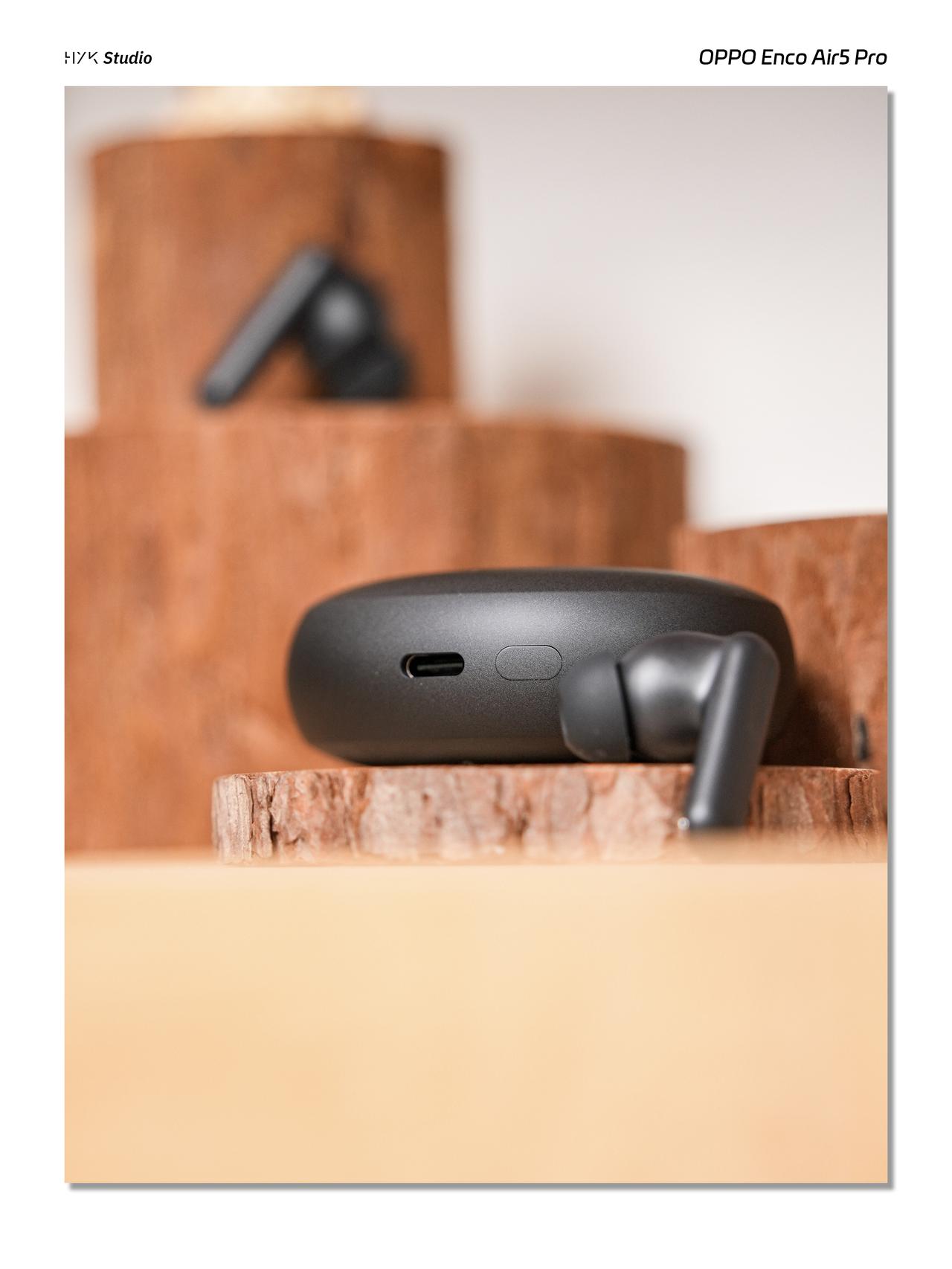 HYK图赏|OPPO Enco Air5 Pro 充电盒和耳机都做了磨砂处理,不容易沾指纹。充电盒是一体成型的椭圆造型,小巧流畅,揣兜里刚刚好,搭配上表面用的与OPPO高端手机同款的准分子喷涂技术,摸起来也很丝滑。耳机本身是人体工学贴耳设计,佩戴的时候耳朵不会胀痛,而且也不容易掉落。在300元这个价位,整体质感还是挺能打的。