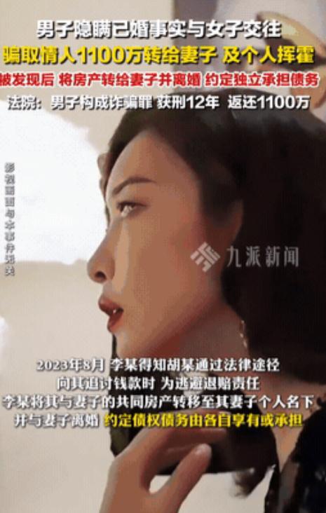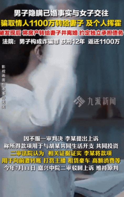 嘉兴,一男子婚内出轨,妻子却感动不已,因为妻子不知道,男子骗取了情人1105万元,而男子除了给妻子转生活费外,大部分都用来挥霍了,当被发现后,男子将房产转到了妻子名下,便提出独自一人承担债务! - 这年头骗子越来越会演,2023年底嘉兴本地论坛一条爆料帖炸锅,说一位女企业家被所谓真命天子骗走1105万,数字听着离谱但后面的操作更离谱,胡女士在生意场上很能打却在感情里栽了大跟头, 她微信里把对方备注成真命天子,这个李某用了整整5年把她当提款机,故事从2018年开始,李某在商业微信群里盯上她,一眼就看出她事业有成又感情空窗,这种人最好下手也最容易被情绪牵着走,于是他开始按剧本推进, 李某从各个角度精心包装自己,先是说硕士学历、进出口生意老板,又在朋友圈晒高尔夫、晚宴合影,还说“忙碌半生没遇懂我的人”,这一套把胡女士防线彻底撬开, 2018年两人关系刚确定他就开始要钱,先说买婚房资金周转不开,50万很快到账,这只是开胃菜后面才是主菜,接下来5年里转账记录60多次,房屋装修项目投资税务稽查供应链货款名目不停换,胡女士的钱像流水一样往外淌, 胡女士也不是没想过把关系坐实,她多次提见家长领证,李某每次都有借口把她挡回去,不是老母亲身体不好就是公司并购要低调,这些理由像防火墙一样把她隔在外面,而墙后真正的现实更扎心,李某早在2003年就领了证,家里还有全职太太小冯和一个上初中的孩子, 这出戏到2023年终于演不下去,诈骗金额破千万后李某嗅到危险,在胡女士报警前几个月他展现出惊人冷静,他发现不对劲就赶紧办离婚,把精装大平层借口家庭财产分配过户给妻子,受害人快报警前又把百万宝马X6用赠与转走,这一套就是提前挪资产给自己留退路,让追回更难, 到了法庭上画面更让人牙痒,李某哭得稀里哗啦拼命撇清妻子和赃款关系,摆出一人做事一人当的姿态,他老婆小冯冷着脸说自己只按月拿生活费,对丈夫巨额收入一概不知,胡女士在庭上数次哽咽想不通5年真心换来的竟是摆拍豪车照片和一堆虚假协议, 李某还想靠诱导签署的赠与协议脱罪,可嘉兴法院不吃这一套,他隐瞒已婚事实虚构投资理由巨额资金流向不明,证据链咬合得死死的直接指向诈骗罪,最终判有期徒刑12年罚金100万元,二审维持原判不给他翻盘机会, 但现实也很残酷,提前转让的大平层和宝马车依旧在他家人名下,胡女士被掏空的1105万大部分早被挥霍,钱追回来很难心里的洞更难补,如今到了2026年春天这案子仍是谈资,它撕开一个难看的真相有人用5年的深情包装一笔买卖, 最可怕的不只是钱没了而是信任被砸碎,李某也许在牢里盘算出狱后的日子,胡女士付出的代价却重得让人不敢轻易再信,说到底世上最贵的不是房车而是你轻易交出去的信任。