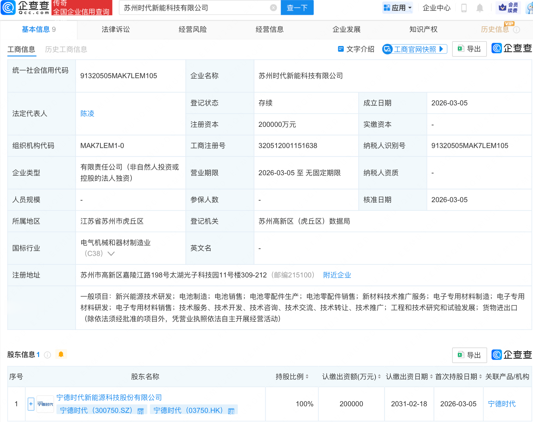 企查查APP显示,近日,苏州时代新能科技有限公司成立,注册资本20亿元,经营范围包含:新兴能源技术研发;电池制造;电池销售;电池零配件生产;电池零配件销售;新材料技术推广服务等。企查查股权穿透显示,该公司由宁德时代(300750.SZ)全资持股。