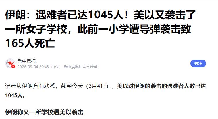 美以接连炸伊朗!女子学校又遭袭,小学165名孩子遇难,总遇难者已达1045人 最近几天,伊朗的事让人看着心里发慌,美国和以色列一个劲地炸伊朗,无辜的老百姓倒了大霉。 截止到3月4号,伊朗那边说,美以袭击已经造成1045人死亡,每一个死者,都是一个好好的家庭被毁掉了。 就在3月4号凌晨,央视记者从伊朗那边得知,美以又动手了,这次炸的是伊朗一所女子学校。 学校里全是手无寸铁的女学生,没有任何打仗的装备,可美以的导弹还是直接打了过去,现在还没说这所学校死了多少人,但想想之前的事,肯定又有不少孩子遭殃。 这已经不是美以第一次炸伊朗的学校了,几天前的2月28号,他们就联手炸了伊朗另一所小学,当场就死了165个孩子。 这所小学里,都是7到12岁的小姑娘,最小的才6岁,正上课呢,导弹一炸,好好的孩子就没了。 学校被炸成了一片废墟,救援的人徒手挖,看到的都是染血的课本、碎书包,还有孩子的遗体,有的都认不出来了。 当地太平间装不下,不少孩子的遗体只能放在冷藏车里,看着就让人难受。伊朗总统很快就发了话,狠狠骂美以太残忍,还让全国人团结起来,一起扛过这场灾难,伊朗也反击了,但还是挡不住美以继续炸。 大家可能会问,美以为啥非要盯着伊朗炸,还专挑学校、老百姓下手?其实就是美以和伊朗一直不和,矛盾几十年了。 美国想控制中东的石油,伊朗不服管,还不和美国用美元做石油生意,动了美国的好处,美国就想打垮伊朗。 以色列也和伊朗有仇,觉得伊朗的导弹和核计划威胁到自己,就跟着美国一起打伊朗。 他们嘴上说炸的是军事目标,其实根本不分,学校、居民区都炸,就是想吓唬伊朗,让伊朗服软。 还有人说,会不会是误炸?根本不是,那所小学在居民区中间,周围没有任何军事设施,美以有先进的设备,不可能不知道那是学校,而且导弹是精准炸在教学楼,就是故意的,他们根本不管老百姓的死活。 到3月4号,除了1045人遇难,还有1200多人受伤,伊朗很多地方都被炸了,老百姓没法正常过日子。 国际上很多国家都骂美以,中国、俄罗斯也要求他们停手,但有些西方国家却帮着美以说话。 说到底,美以就是为了自己的好处,才这么欺负伊朗。我们普通人管不了别的,但都知道,打仗最受苦的是老百姓,尤其是孩子。 希望美以赶紧停手,别再伤害无辜的人,有啥矛盾好好说,让伊朗老百姓能安安稳稳过日子,让幸存的孩子能重新回到教室里读书。
