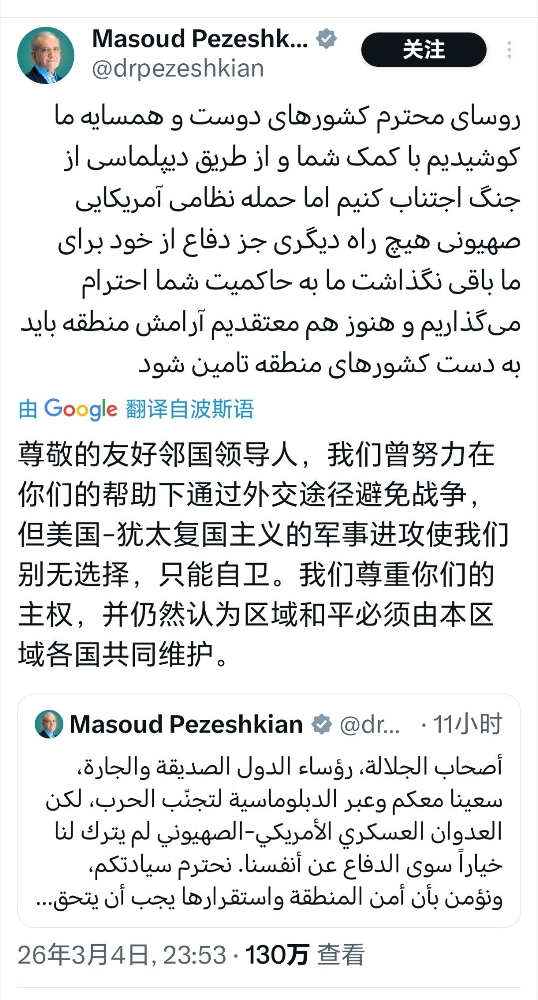 伊朗总统向邻国喊话自卫是别无选择伊朗总统佩泽希齐扬用阿拉伯语和波斯语发帖,尊敬的友好邻国领导人,我们曾努力在你们的帮助下通过外交途径避免战争,但美国-犹太复国主义的军事进攻使我们别无选择,只能自卫。我们尊重你们的主权,并仍然认为区域和平必须由本区域各国共同维护。