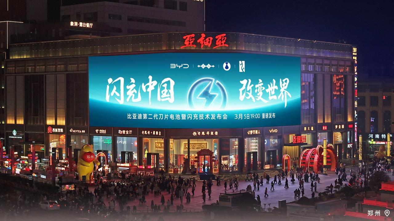 比亚迪这次的新技术,太横了,解决了很多新能源车的传统痛点。靠的就是二代刀片电池和新的闪充技术。闪充到底有多快,大家可以3月5日晚上发布会看直播。可以负责任的说,友商又有的追了。 新的技术,有足够份量的技术,也需要配合更强的宣传策略。比亚迪猛发力,在全国多地城市CBD大屏地标预告,广州,深圳,成都,苏州等城市都有投放,标语也是很给力。就是要直白告诉大家,他的新技术到底有多强。 据了解,为了突出晚上发布会的主题,王力宏也会现场演唱《改变世界》这首歌。 在比亚迪展示活动现场转了半天了,个人感觉这套技术确实很有东西,大家可以期待了。【来自懂车帝车友圈】