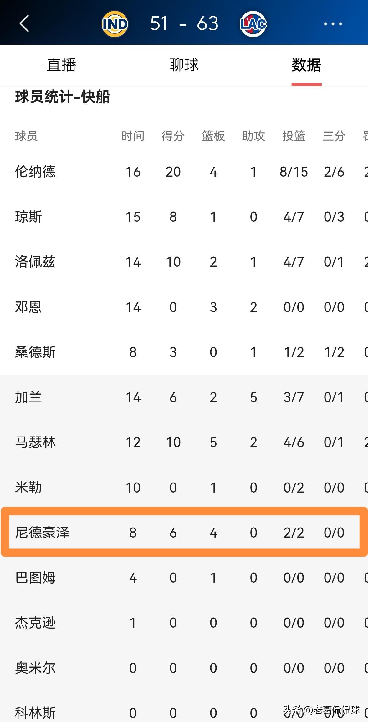 快船新秀尼德豪泽真是太让人惋惜了!在今天快船主场迎战步行者的比赛中,目前双方的上半场比赛已经结束,快船以63:51领先对手12分。让人感到特别惋惜的是,在前两节比赛中,尼德豪泽在状态非常出色的情况下不慎受伤离场,他在替补出战的8分钟里,投篮2中2,其中罚球2中2得到6分4篮板2盖帽,没有出现任何的失误和犯规,他的场上正负值为+14。