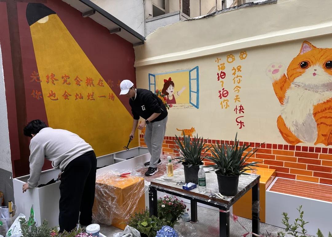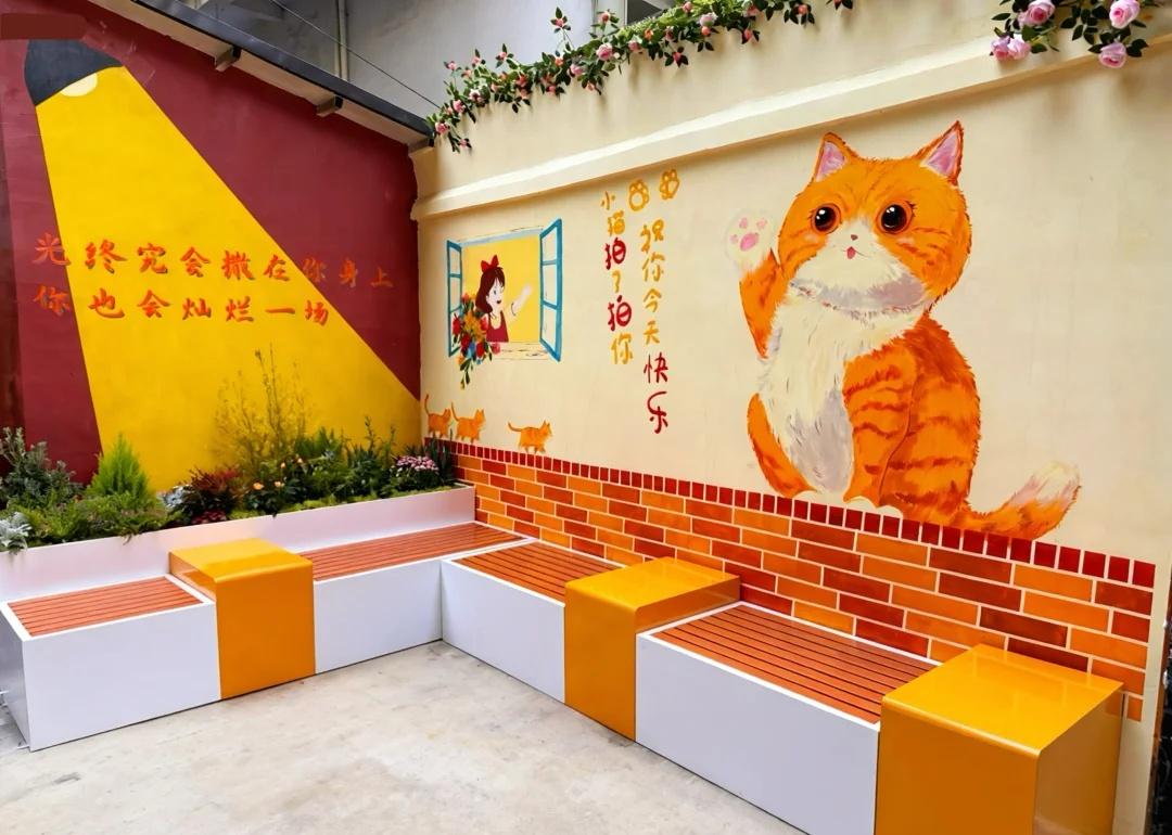 老社区改造,真的不必等“大手笔” 改前:每个城市都有的“遗忘角落” ❶ 破损白地砖 + 随意堆放的旧椅子旧车 ❷ 背景是晾晒的衣物、杂乱的电线楼梯 ❸ 一片“凑合过吧”的灰暗气息… 说实话,这种角落除了路过,不会有人想停留一秒。 改后:我们社区专属的“情绪充电站”🔋 ❶ 墙面会说话! 橘白大猫咪+治愈标语,经过就想拍一张 ❷ 废椅变宝座! L型橙白座椅+头顶粉花,成了阿姨聊天、孩子玩耍、年轻人发呆的据点 ❸ 旧砖新生机! 红砖墙漆成图案,配上绿植,杂乱感秒变文艺感 ------ 为什么我觉得这次改造值得夸? ✅ 没大拆大建,却精准戳中需求 不是推倒重来,而是在原有基础上“点石成金”。保留了长凳、墙面,只是加了色彩、图案和重组,成本低、见效快。 ✅ 真正“为人设计”,而不只是“为好看” 那句“小猫拍了拍你”和“光终究会洒在你身上”,就像社区在轻轻对你说话。座位面向开阔处,既私密又不封闭——这是懂心理学的设计! ✅ 激活了社区的“边缘空间” 原来谁都懒得看的地方,现在成了打卡点、社交角。小朋友来看猫,老人来晒太阳,年轻人来拍照——一个角落,盘活了整栋楼的情绪。 有时候,一点色彩、一句标语、一排座椅, 就能把“被遗忘的边角料”,变成“人人都爱的温暖角落”。 如果你们的社区也有这样的潜力角落, 强烈建议把这篇转给物业/业委会看看! 好的改造,是让日子发光,而不只是让墙面刷新。 城市更新 一个有温度的社区 社区治理老小区改造 社区更新 微改造大幸福 旧物利用 设计改变生活 城市美学