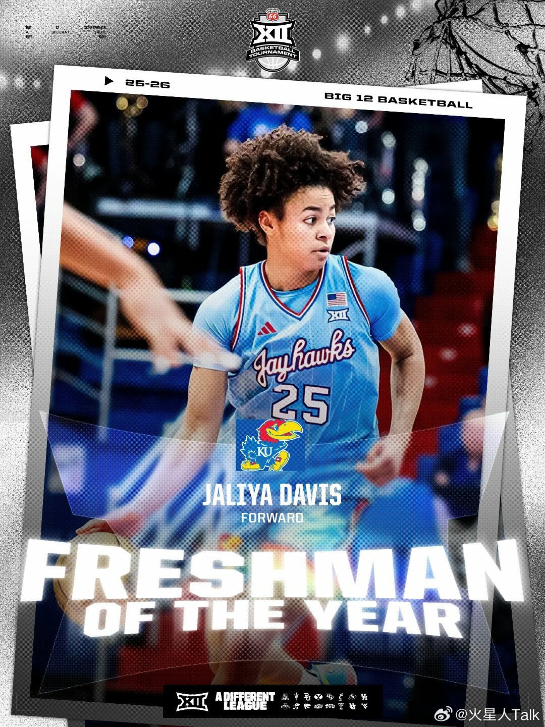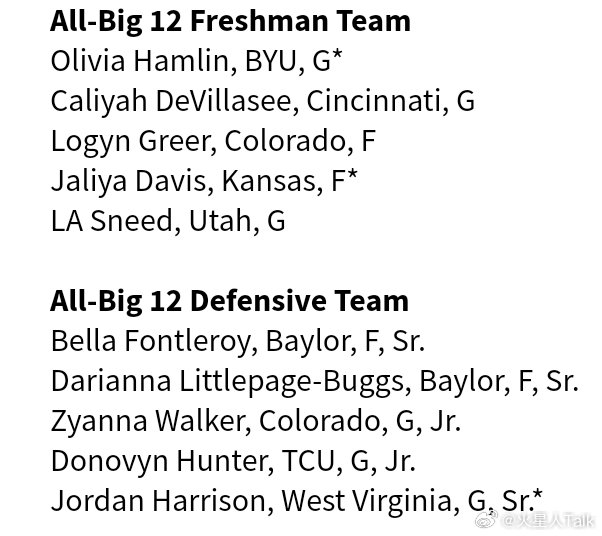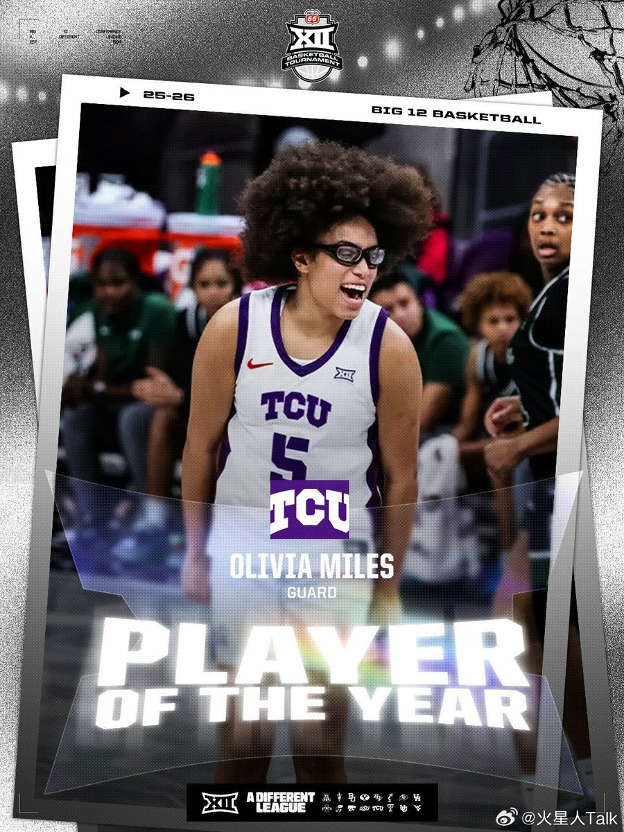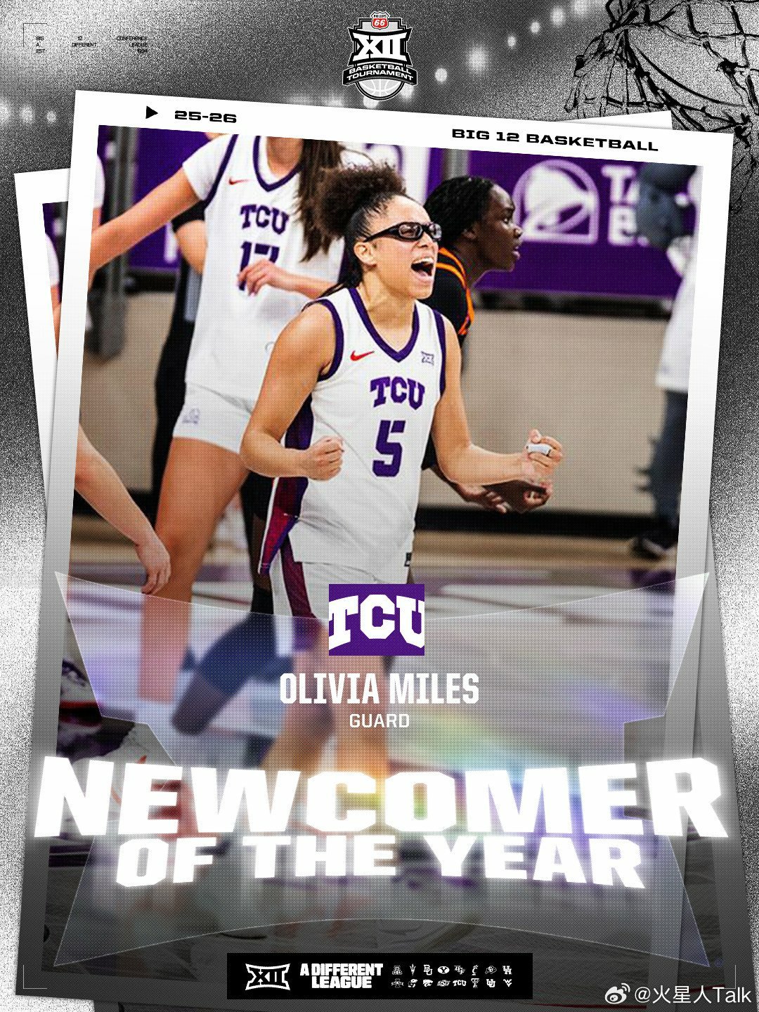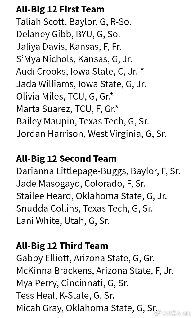 NCAA女篮 2025-2026赛季Big 12联盟常规赛表现奖和最佳阵容。 最佳球员:Olivia Miles。最佳防守球员:Jordan Harrison。最佳新生:Jaliya Davis。最佳新人:Olivia Miles。最佳第六人:Snudda Collins。最佳教练:Krista Gerlich。最佳学者运动员:Arianna Jackson。
