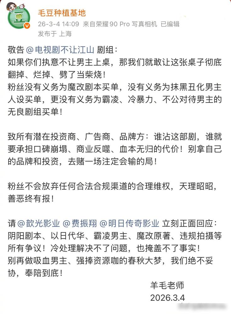 谁敢动杨洋的江山,粉丝就敢掀谁的桌子。 对接账号深夜连发檄文,直接把矛头戳向投资方和剧组:如果不改剧本、不撤阴阳戏份,谁投钱我们就讨伐谁,谁买广告我们就抵制谁。这种破釜沉舟的狠劲,在内娱圈里极其罕见。 开机仪式上杨洋左手还缠着厚厚的绷带,带着一身伤进组,换来的却是戏份被砍、人设降智、妆造甚至不如配角精致。原著作者知白更是用行动投了票,反手取关官微,全网只关注杨洋一人。这种明晃晃的背刺,粉丝绝不可能忍气吞声。 虽然杨洋本人发文想稳住局面,但这种维稳更像是给资方留的最后体面。现在的局面不是在无理取闹,而是在据理力争。 别让满腔热血的演员流了血又流泪,别让粗制滥造的剧本赢了流量却丢了良心。这不仅是在保卫一个角色,更是在守住演艺圈最后的尊严。