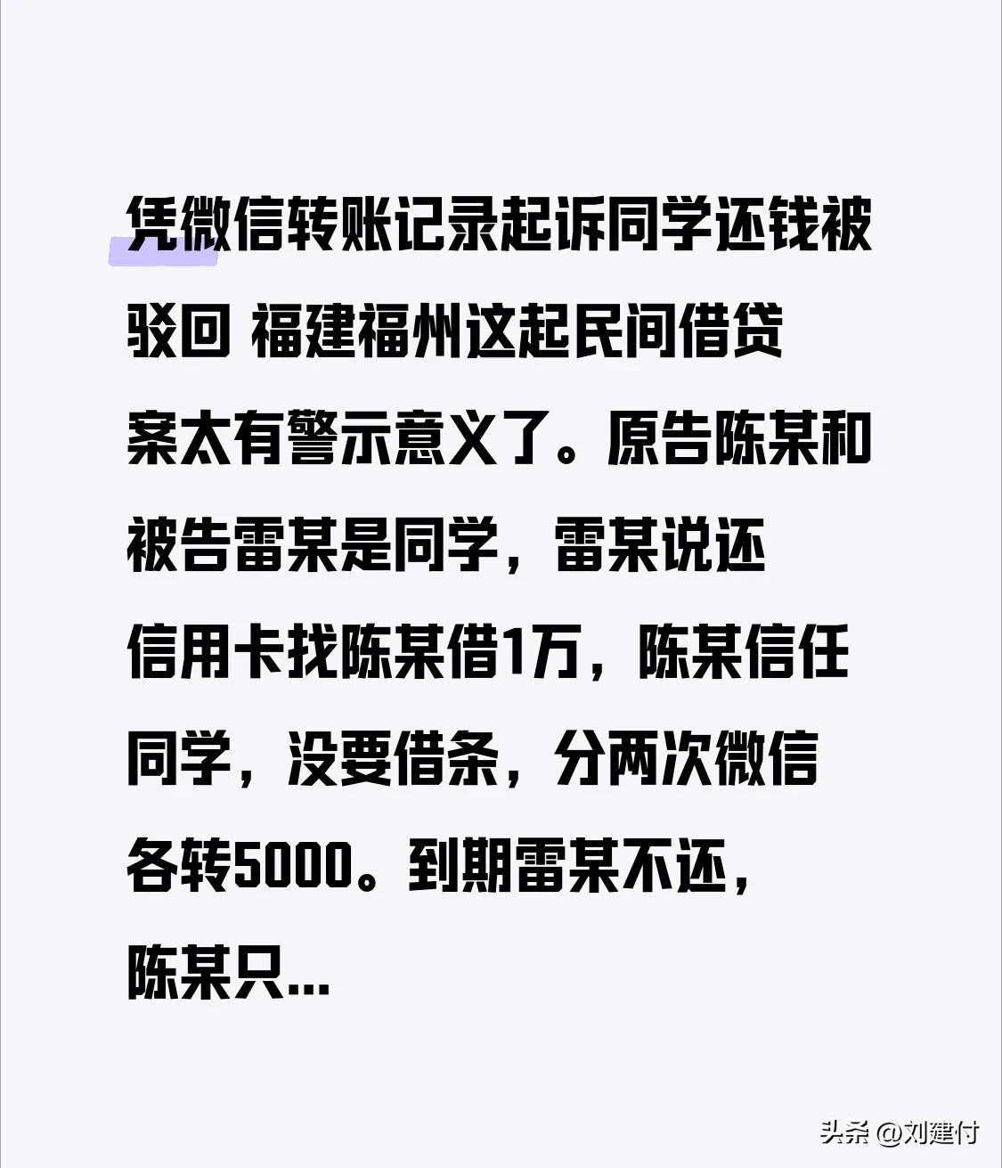 凭微信转账记录起诉同学还钱被驳回 福建福州一起民间借贷案,凭微信转账记录起诉同学还钱被驳回,极具警示意义。原告陈某与被告雷某是同学,雷某以还信用卡为由向陈某借1万,陈某信任同学,未要借条,分两次各微信转账5000。到期雷某未还,陈某只能起诉。 庭审时,雷某否认借款,称这是陈某归还之前用他信用卡套现的钱。法院驳回陈某诉求,因民间借贷需有借钱约定和转账事实,转账记录无法证明这是借款。 很多人碍于情面,熟人借钱不写借条,最终钱难以收回。以后借钱一定要写借条、转账备注借款、保留聊天和催还记录,别让信任变成损失。
