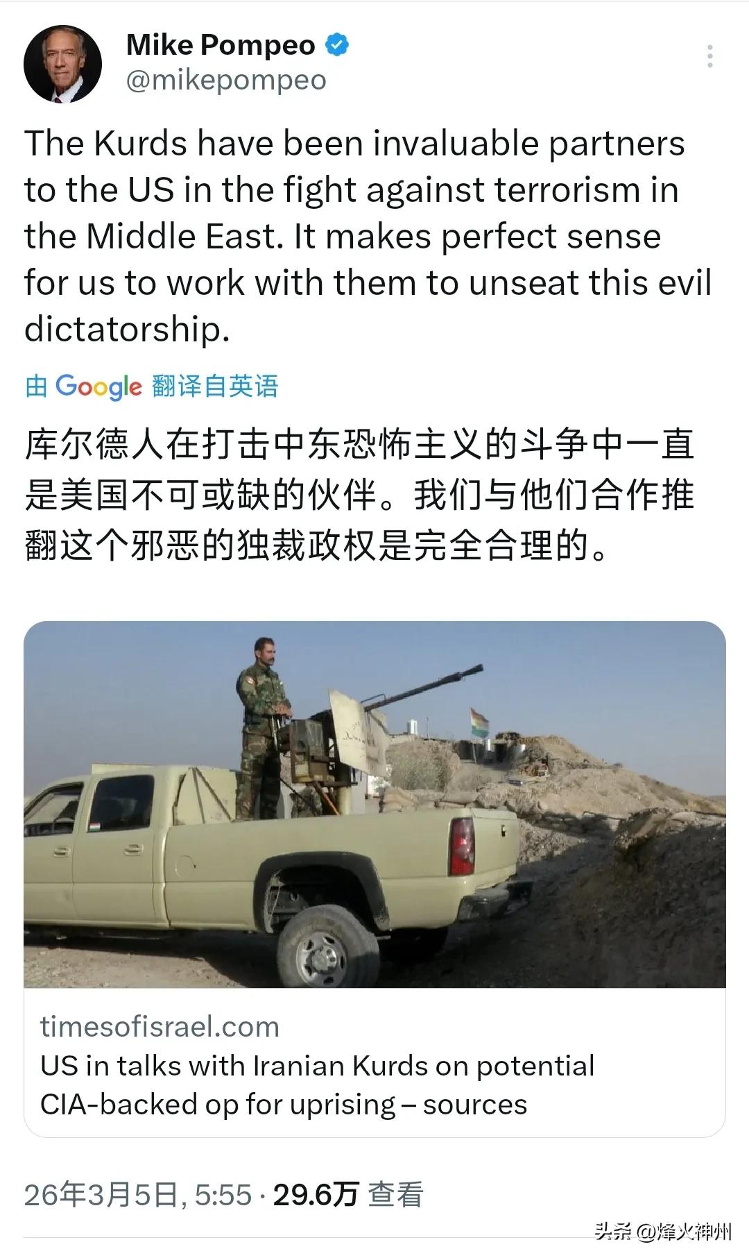 美国前国务卿蓬佩奥今天(北京时间3月5日)写道:“库尔德人在打击中东恐怖主义的斗争中一直是美国不可或缺的伙伴。我们与他们合作推翻这个邪恶的独裁政权是完全合理的。” 【蓬佩奥转发了以色列时报的报道:美国正与伊朗库尔德人就可能由CIA支持的行动进行谈判。】 评几句: 蓬佩奥公然宣称要联合库尔德人推翻伊朗政权,并证实美国正通过CIA策动分裂行动,这番言论彻底撕下美式霸权的遮羞布,将代理人战争的阴谋摆上台面。 以“反恐伙伴”为诱饵,暗中武装分裂势力,干涉他国内政、煽动地区内乱,早已是美国屡试不爽的套路。蓬佩奥之流无视主权国家底线,将库尔德人当作消耗伊朗的马前卒,本质是不敢正面投入地面战争,只想用低成本手段颠覆政权。 美国从不关心库尔德人的前途,更不在乎伊朗人民的死活,一切行动只为维护自身在中东的霸权私利。这种挑动民族矛盾、制造国家分裂的卑劣行径,只会让中东陷入更深的战火与动荡。 从撒谎欺骗到策动分裂,美国的霸权底色一览无余。靠代理人搅乱地区、靠阴谋维系强权,注定不得人心,最终只会搬起石头砸自己的脚。