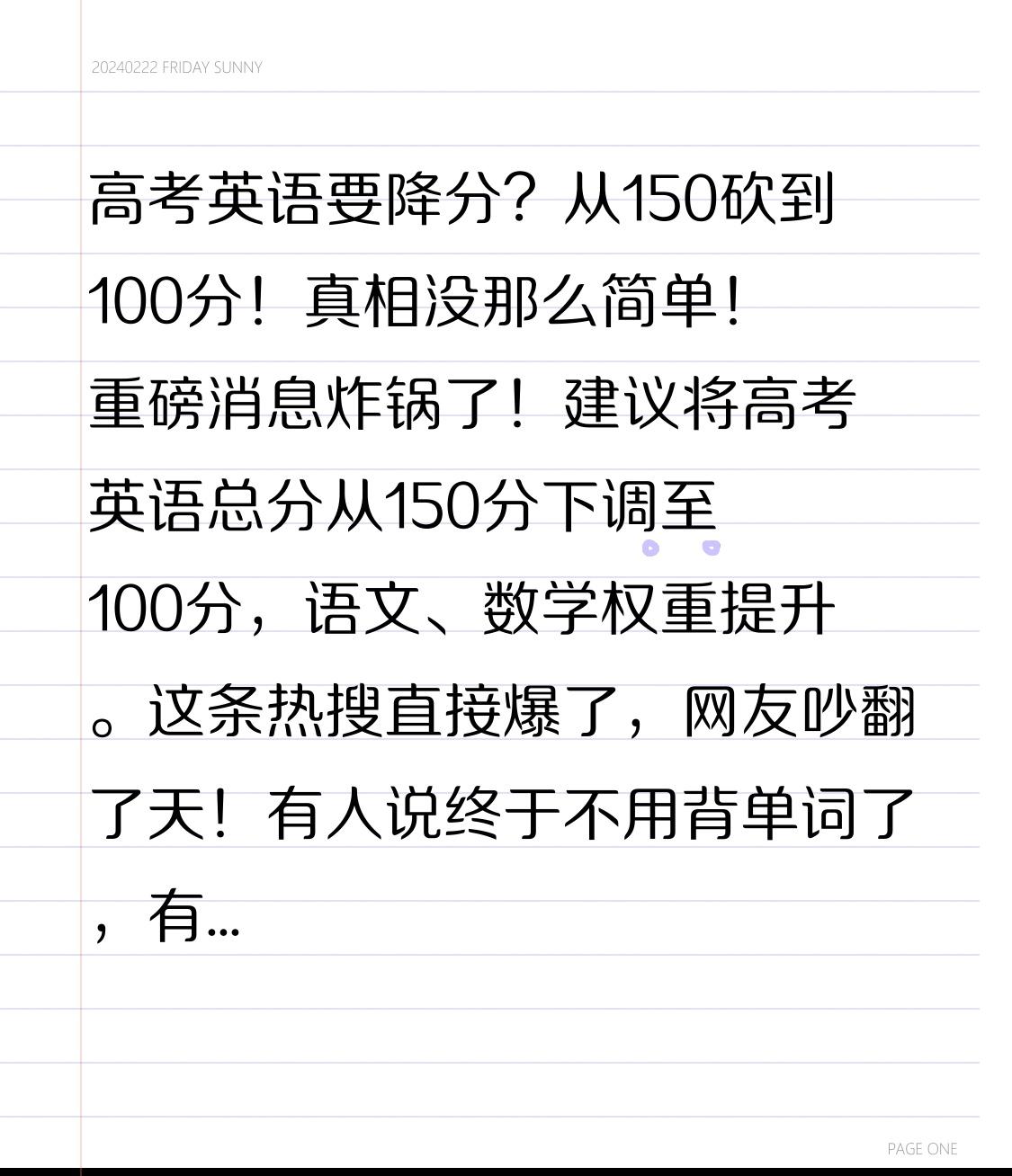 高考英语要降分?从150砍到100分!真相没那么简单! 重磅消息炸锅了!建议将高考英语总分从150分下调至100分,语文、数学权重提升。这条热搜直接爆了,网友吵翻了天!有人说终于不用背单词了,有人说这是断人财路,今天咱们掰开揉碎了讲,这到底是好事还是坏事? 先看支持者的声音:英语占分太高,很多学生倾尽全力学了十年,最后除了考试啥也不会,毕业就还给老师,成了典型的“应试教育”。而且现在AI翻译、工具这么发达,日常交流根本不愁,降低分值是不是顺应时代? 但转折点来了!反对者拍案而起:这绝对是换汤不换药的馊主意! 高考是选拔性考试,分值少了,竞争只会更卷。以前英语考140分是学霸,现在考90分就是及格,为了那少得可怜的分数,学生得卷得更变态。英语权重低了,就真的不学了吗?国际交流日益频繁,咱们的科技、商业都要走向世界,不懂英语,怎么去对接全球前沿技术? 更现实的问题是:谁最受益?谁最吃亏? 家庭条件好的孩子,从小上双语学校、外教一对一,英语底子本来就好。分值降低,对他们来说毫无压力,反而少了一门拉分的学科。而那些普通家庭的孩子,英语可能是唯一能靠刷题逆袭的科目。把英语分值砍下去,寒门子弟想要通过教育改变命运,难度直接翻倍! 其实大家真正不满的,不是英语本身,而是“低效的应试学习”。我们需要的不是简单的降分,而是改革考试模式,减少死记硬背,增加口语应用和实际能力考察。 把英语从“生死线”变成“工具课”,这才是初衷。但在教育资源均衡之前,盲目降分,很可能让内卷从英语科,转移到更隐秘的角落。 教育改革任重道远。无论分数怎么变,保持学习的能力,拥有看世界的视野,才是一辈子的硬通货。
