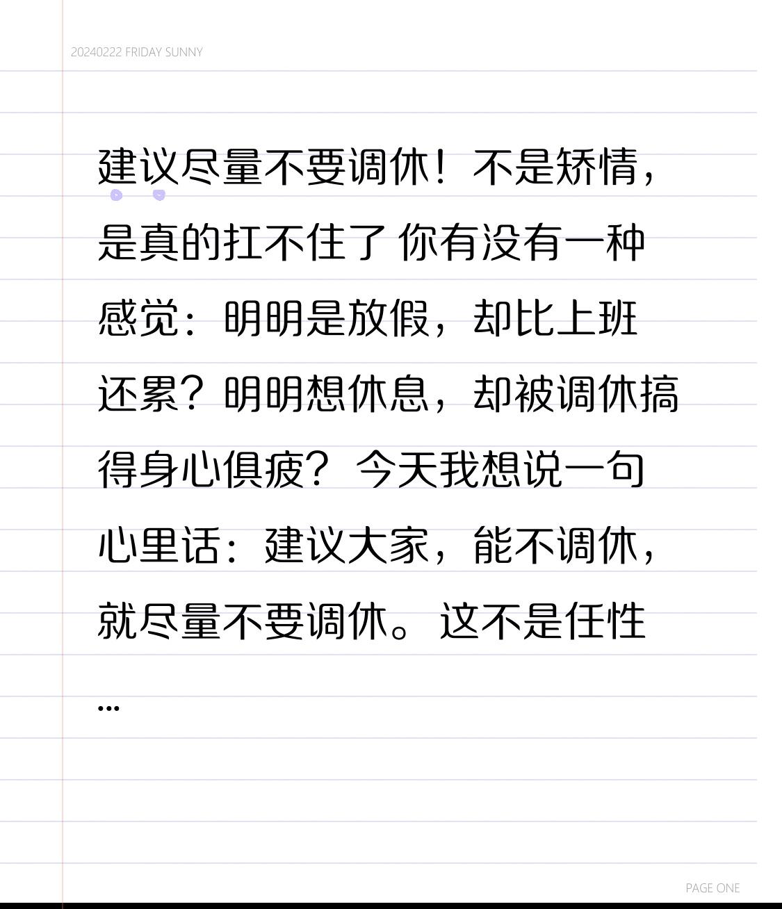 建议尽量不要调休!不是矫情,是真的扛不住了 你有没有一种感觉:明明是放假,却比上班还累?明明想休息,却被调休搞得身心俱疲? 今天我想说一句心里话:建议大家,能不调休,就尽量不要调休。 这不是任性,也不是矫情,而是无数打工人用亲身经历总结出来的真相。 一到小长假,最期待的是假期,最崩溃的就是调休。本来只想安安稳稳歇两天,结果硬生生变成连上六天、七天班,假期还没缓过来,身体先垮了。早起困难、精神恍惚、效率暴跌,甚至连情绪都变得暴躁易怒。 很多人以为:多放几天假多香啊! 可真正的转折点来了——调休式放假,根本不是休息,是透支。 你用连续上班的疲惫,换来了看似很长的假期,可玩的时候惦记着上班,上班的时候熬不到头。出门旅游堵在路上,回家休息赶不上节奏,最后钱花了、人累了、班也上不好,得不偿失。 更真实的是,对大多数普通人来说,我们要的不是“凑出来的长假”,而是踏踏实实、不用补班、不用熬夜、不用透支身体的正常休息。 周末就是周末,假期就是假期,别拆东墙补西墙,别让休息变成负担,别让放松变成焦虑。 我们努力工作,不是为了连轴转,而是为了有时间陪伴家人、有精力照顾自己、有心情好好生活。身体不是机器,扛不住无休止的透支;情绪也有底线,经不起反复消耗。 所以我真心建议:能不调休就不调休,能正常休息就别硬凑长假。 好好睡一觉,好好吃顿饭,好好发会儿呆,比什么都重要。 打工人的快乐很简单:不熬夜、不补班、不内耗、不疲惫。 愿我们都能拥有真正的休息,而不是被调休绑架的生活。 点赞转发,说出所有打工人的心声!