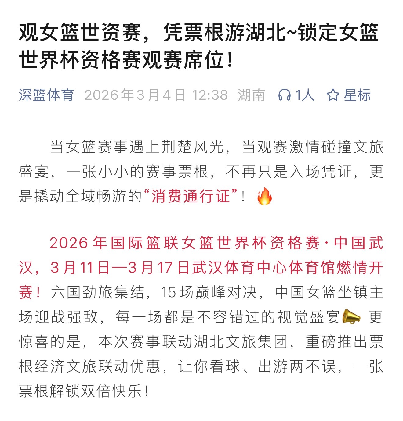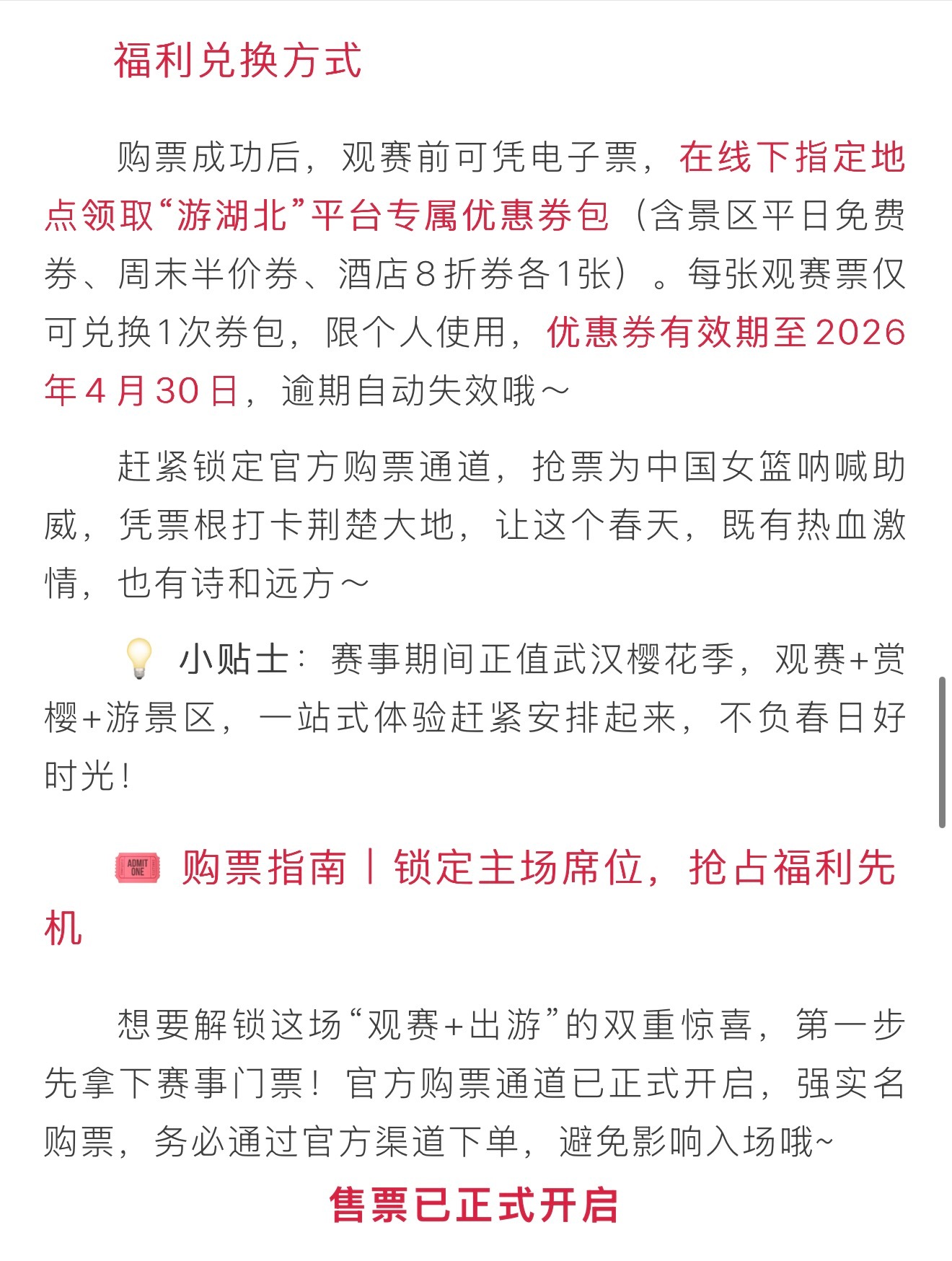 2026年国际篮联女篮世界杯资格赛落地湖北武汉,中国篮球之队推出了凭票根游湖北活