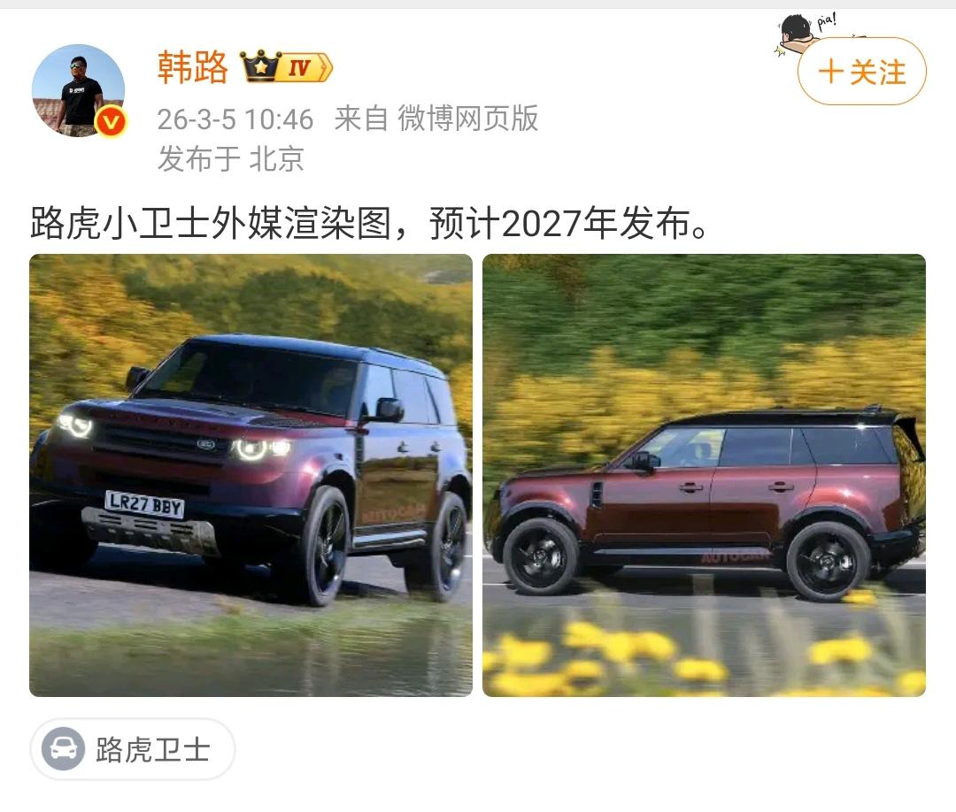 韩路:路虎小卫士外媒渲染图,预计2027年发布! 这个渲染图看起来真的是非常的帅,路虎车型现在卖的最好的就是卫士和揽胜这两个了,之前的发现卖的也挺好的,但是改款之后卖的就不如以前那么好了。 各位是怎么看的?欢迎评论区留言。