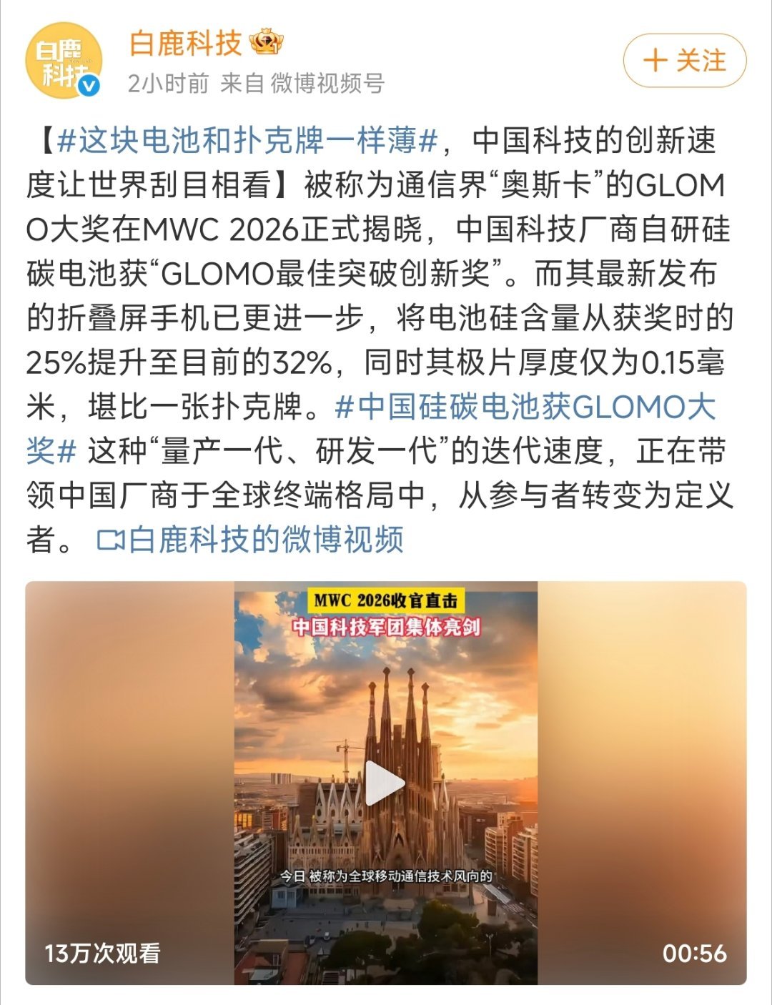 神奇,荣耀自研青海湖刀片电池得到的GLOMO最佳创新奖,奖杯🏆终于给到荣耀了,可是这已经是去年的产品V5获得的那时候电池硅含量是25%,现在已经是32%了!不得不说,颁奖评选速度远远比不上科技进步的脚步~中国硅碳电池获GLOMO大奖