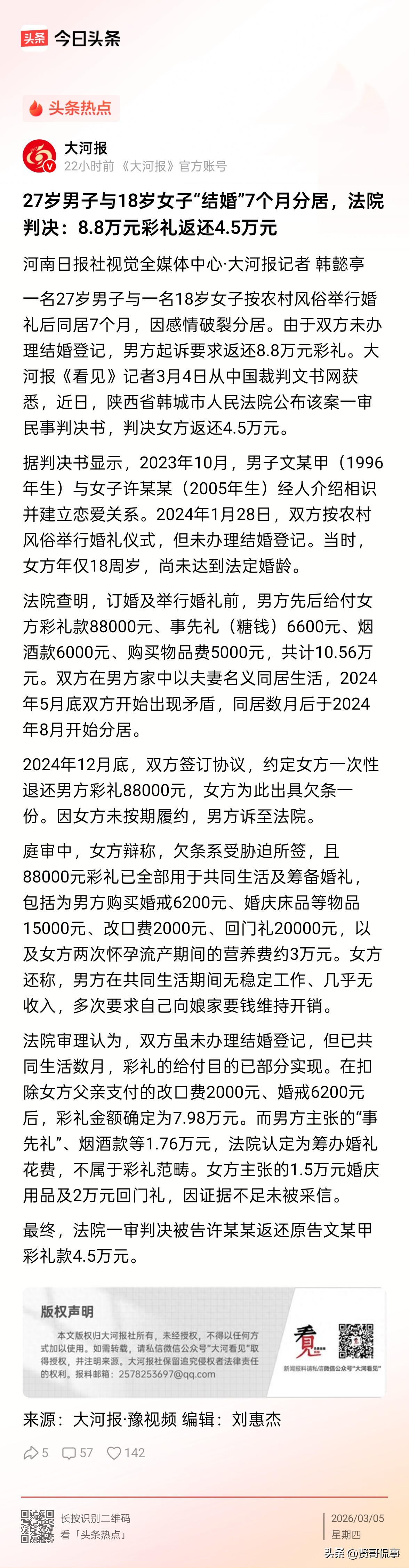 陕西韩城,一28岁男子花费88000元彩礼迎娶18岁新娘。因女方未达法定婚龄,二人仅举办婚礼,并未领证。然而,两人同居仅7个月便产生矛盾。男子为讨回彩礼及其他花销共计105600元,将女方告上法院。对此,女方反驳道:“我两次怀孕流产又怎么算?” 2023年10月,27岁的文某经人介绍,认识了年仅18岁的许某,两人很快确定了恋爱关系。 在农村长辈看来,年纪到了就该成家,双方家庭商量后,一拍即合,在2024年1月按照当地风俗为两位新人举办了婚礼。 但当时许某还没到法定结婚年龄,两人便未领取结婚证。 为了这场婚事,文某向许某一方支付了彩礼88000元,加上糖钱、烟酒、礼品等各种费用,结婚一共花了105600元。 婚礼过后,两人便开始了同居生活,可日子并没有想象中过得那么美满。 文某没有稳定工作,收入也不稳定,家里的日常开销大多需要许某贴补,时间久了,自然矛盾越来越多。 更让许某委屈的是,同居期间她两次怀孕又两次流产,身体受到了不小的伤害不说,营养费、护理费也花了不少钱。 2024年5月,两人开始频繁吵架,到了8月,彻底分居。 最后,两人实在没办法再过下去了,便签订协议,约定许某一次性退还彩礼88000元,双方一拍两散,许某为此还写下了欠条。 可许某迟迟没有还钱,文某无奈之下,将她告上了法院。 文某认为,自己家花了十万多娶许某,如今婚事没成,对方就该按照约定还钱。 而许某则表示,之前写下的欠条不应作数,因为自己受到了文某一方的胁迫的。 此外,男方给的彩礼早已用于两人共同生活、筹备婚礼,以及自己流产后的营养开支,不应再还任何钱了。 从法律上讲,根据《民法典》及相关司法解释规定,的确,两人没有办理结婚登记,不属于合法夫妻,文某一方可以向许某要求返还彩礼。 但还要考虑到,两人实际上已经共同生活数月,彩礼的结婚目的已经部分实现,在退还的数额上要予以考量,不能全部退回。 法院审理后认为,文某一方为举办婚礼花费的糖钱、烟酒款等17600元,属于婚礼正常花费,不算彩礼;扣除女方支付的改口费和婚戒费用后,实际彩礼为79800元。 综合考虑两人同居的时间、许某身体受损、彩礼实际使用情况等因素,法院最终判决许某某返还文某彩礼45000元。 该判决一出,也引起了网友的热议: 有人心疼男方,认为农村家庭攒十万真的很难!办了酒娶了媳妇,最后只退一半,简直亏大发了! 有人则选择站女方:“18岁刚成年就跟他同居,两次流产伤身体,是一辈子的隐患!退4万5还多了些,身体受损用钱能算清吗?” 就个人来看,双方都有付出,但也都有做的不当的地方。 男方付出了金钱和时间,到头来却一场空。 女方小小年纪则承受了身体和心理的双重伤害。 说到底,根源还是在于对婚姻问题太过于草率。 两人相识不到半年,连对方的基本情况、生活习惯、个人品性都没搞清楚,就匆匆走向婚姻。 结果可想而知,婚姻的基础不牢靠,婚姻的大厦顷刻间倒塌,最终只能两败俱伤。 所以,也希望大家在对待婚姻问题上,能多一份清醒和慎重,慢一点了解,稳一点相处,认真对待感情,也好好保护自己。 对此,你怎么看?欢迎大家在评论区留言。