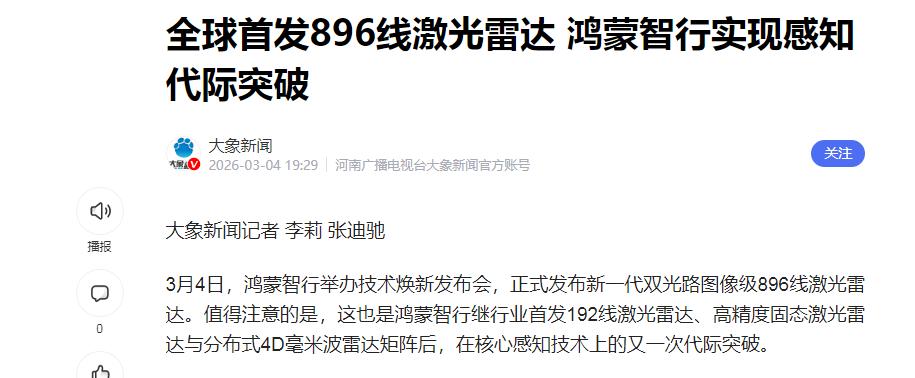 强烈建议军队方面关注这一科技动态。在华为鸿蒙智行技术焕新发布会上,尊界首发的华为双光路图像级激光雷达,从192线直接推到896线。这可是满满的黑科技,在军事领域也有极为广泛的应用。 别眨眼,看完绝对刷新你的认知。让我们一起来聊聊,这才是科技热潮背后真正让人兴奋的地方。 先说说,这次业界热议的点——线数从192一口气跃升到896,这个数字听起来挺玄乎,到底有啥用? 就能让原来模糊的点变成高清的大图,就像你用高清摄像头看世界一样,自然什么细节都逃不掉。 896线的激光雷达把图像分得更细,物体轮廓处理得比以前那个192线的分明太多,可以说是“看得更清,更远,更快”。 这性能放到全球量产产品榜单,妥妥当当的第一梯队。 大家日常刷短视频,应该经常能看到“XX车型自动驾驶测试”,尤其是中国车圈最近国产高端车型频频说“首发搭载高线数激光雷达”,其实都是奔着这项黑科技去的。 华为这波操作,为自动驾驶提供了肉眼都追不上的前方侦测能力。 但刚刚我们说的,技术要让人眼前一亮,还要能让我们的军用领域也受益才算是真正牛啊。 军事用途,说实话,很长时间里普通人压根没啥概念。 大多数人的脑海里,雷达就是军舰和飞机那几个大转盘,顶多是战争片里扫描目标的背景板。 可实际上,现代军事技术的革新,背后都是一堆民用科技在驱动,而激光雷达从“看汽车”变成“看敌人飞机”,其实就是一次民技军用的现实案例。 896线,再结合图像级处理,最大改变是什么? 是目标识别能力的质变,特别是面对隐形目标的时候,别说卫星图像费时费力,激光雷达的精度和分辨率,可以让虚掩的目标都原形毕露。 传统军用雷达训练有多难?其实懂行的都知道,雷达信号处理是一门复杂的手艺,能把一堆莫名其妙的数据点解读成准确目标,需要长年累月训练,这真不是吹。 以前咱们雷达兵要靠耳朵、经验甚至直觉辨别信号,数据波一出错,飞机就可能飞走了。 可一旦图像级激光雷达普及,信号处理直接变成“看图”,新兵蛋子也能轻松入门,拿起终端就操作,极大降低了技术门槛。 这就像是“学B站剪辑不用苦练AE,只需几个模板一键生成”,速度和效率提升不是一点点。 这个变革,能让“人才培养”迎来质的跃升。 以往雷达兵要几年才能上手,未来或许几周就能拥有一大批合格的新手操作员,从而极大缓解了专业人才紧缺的问题,这对加强国防实力,效率上的提升相当明显,根本不用再担心“师傅带出徒弟慢”这种老问题了。 其实在一线讨论里,经常有人拿“军用技术一定领先民用技术”来做文章。 现实真的这么吗?至少在目前的信息科技领域,有不少专家和技术人员都发现,这条路已经走到了一个历史转折点。 说实话,现如今某些前沿的民用技术,如激光雷达、高精定位芯片、智能算法等,随着国家政策的引导和大厂的投入,研发和量产都已领跑。 比如华为这次把头顶的牌子打到896线,的确是把“把简单的民用技术反向推进军事科技”的话题摆到了桌面上。 我们国家其实很早就有“民参军”“军民融合”的战略,但这几年明眼人能看出明显变化,现在是“商业先行,军事跟进”的格局越来越多。 原因很简单,企业竞争、用户需求以及资本带来的开发效率,让类似激光雷达这样的黑科技可以大量投入研发,“百花齐放”推动成果比以往更快落地。 而且在全球范围内,谁有最先进的传感设备,谁掌握了实时精准的数据流,谁就在信息战时代获得先机。 回顾历史,老祖宗发明火药,欧洲人却拿去先搞成军事利器,咱们最初却多用来做烟花爆竹。 这个教训大家都懂,这也是为什么现在无论行业还是专家都在呼吁:“别让类似激光雷达这种领先世界的新科技仅仅停留在民用,应该高度警惕‘民用领先、军用滞后’的现象,及时推动新技术应用转化,拉近商用和军用的差距。” 很多人问,这项新技术为啥被认为对隐形装备效果突出? 其实原理很简单,激光雷达是用激光脉冲测距,区别于传统雷达靠电磁波、信号容易被屏蔽或干扰。 高线数加持下,即使隐形飞机外形复杂、边角低反射,图像级激光雷达也能通过细节反射精准重建其三维形态,这是传统手段很难做到的。 这对提升国军防空、反隐形能力无疑是颠覆级的,加上后端AI算法支持,识别速度也飞快,假如能率先大规模装配,各类目标隐藏的难度就被大大降低了。 参考: 大象新闻——全球首发896线激光雷达 鸿蒙智行实现感知代际突破