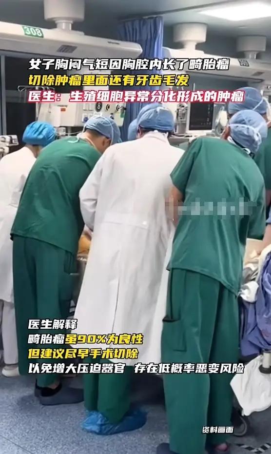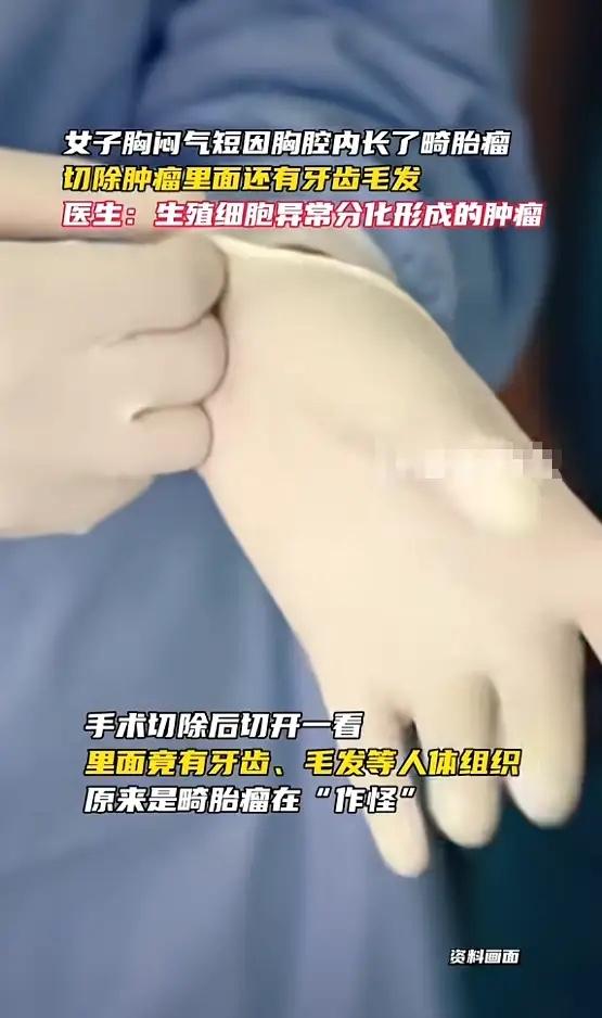 “活久见!”近日,杭州萧山,一女子身体一直不错,可前段时间,她感觉莫名胸闷,随着症状严重后,她赶紧去了医院,最后发现胸腔前纵隔内有个肿瘤,当医生将肿瘤摘除切开时,发现里面竟然咱有牙齿和毛发,才知道是畸胎瘤做怪!网友:太吓人了! 这事儿发生在萧山一位三十岁的赵女士身上。她平时身体挺好,没什么大毛病。大概半个月前,她开始觉得胸口发闷,像有块石头轻轻压着。一开始没当回事,以为是工作太累,熬夜多了,想着年轻人扛一扛就过去了。 可这胸闷的感觉非但没减轻,反而越来越重。发展到后来,就连在家里慢走几步,都明显感觉气不够用,喘得厉害。正常上下班都成了难题。赵女士这才真的慌了,赶紧去了萧山区第一人民医院的胸外科。 医生给她做了胸部CT,结果在她胸腔的前纵隔位置,长了一个直径大约8厘米的肿瘤。这个位置前面是胸骨,后面是心脏和大血管。肿瘤已经不小,开始压迫到她的气道和肺部,难怪她会喘不上气。医生建议她必须尽快手术摘除。 手术很顺利,医生通过微创的方式,完整地把这个肿瘤取了出来。当医生在手术室里把切下来的肿瘤剖开时,眼前的一幕让见多识广的医护人员也感到惊讶。肿瘤里面,竟然包裹着清晰可见的牙齿和毛发! 医生解释说这就是畸胎瘤,这名字听起来吓人,但它既不是“怪胎”,也不是你身体里藏了个“孪生兄弟姊妹”。它其实是一种生殖细胞肿瘤。在我们每个人胚胎发育的早期,有一些具有分化潜能的“全能”生殖细胞。绝大多数都去了该去的地方,发育成正常的组织。但极少数细胞可能“迷了路”,跑到了胸腔、卵巢这些地方“定居”下来。这些细胞没有被身体正常调控,在某些因素刺激下,就开始无序生长,形成了一个肿瘤。 正因为这些细胞有分化成各种组织的潜力,所以这个肿瘤里就可能长出乱七八糟的东西,比如皮肤、油脂、毛发,甚至牙齿和骨头。大约90%的畸胎瘤是良性的。但即便是良性,也绝不能掉以轻心。因为它会不断长大,持续压迫周围重要的器官,比如心脏、肺部、大血管,引起更严重的症状。而且,它还存在极低的恶变风险。所以一旦发现,通常都建议尽早手术切除。 身体发出的信号,千万别硬扛。像赵女士这种莫名的、持续加重的胸闷,就是一个非常明确的警报。很多疾病在早期都没有典型症状,定期体检真的能发现大问题。畸胎瘤本身不可怕,可怕的是忽视它,让它长到压迫器官甚至发生恶变。 各位读者你们怎么看?欢迎在评论区讨论。