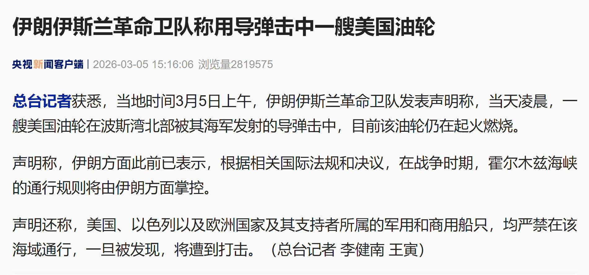伊朗攻击一艘美国油轮,应该是对前一天(3月4日)美军击沉一艘伊朗护卫舰的反击;而伊朗宣布的霍尔木兹海峡新规则,也算是将该海峡由之前的完全封锁,改为了只禁止美以欧洲船只的不完全封锁,只是不知道伊朗有没有足够的精力去分辨这些船只……伊方称导弹击中一美国油轮美伊以冲突热点现场