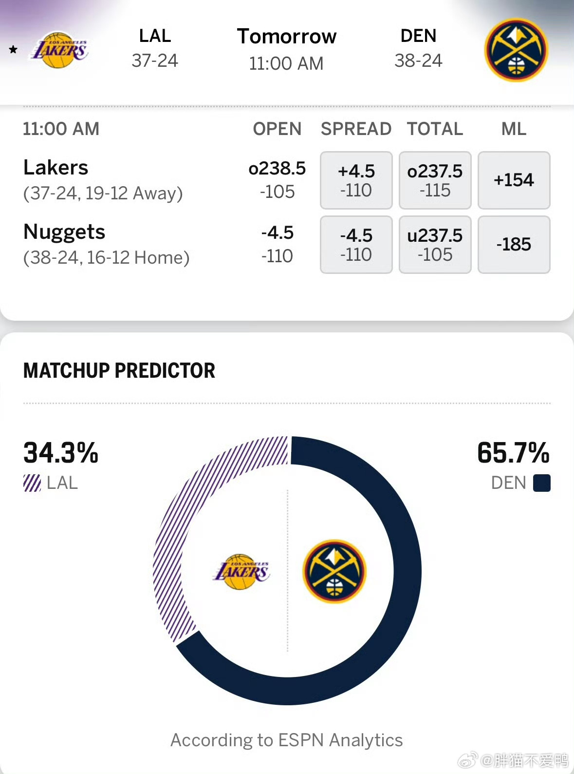 ESPN这次给到湖人的胜率只有34.3!而掘金居然高达65.7%!
