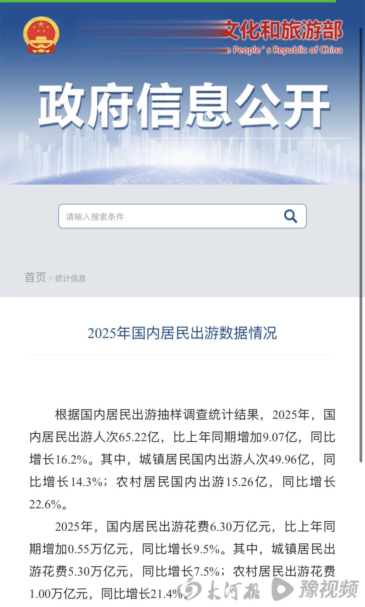 回望2025年,报告用数据为文旅活力写下注脚:国内出游人次增长16.2%,入境旅游人次增长17.1%。而文旅部1月26日发布的统计数据进一步印证了这一趋势——2025年国内居民出游人次达65.22亿,同比增长16.2%;出游花费6.30万亿元,同比增长9.5%。