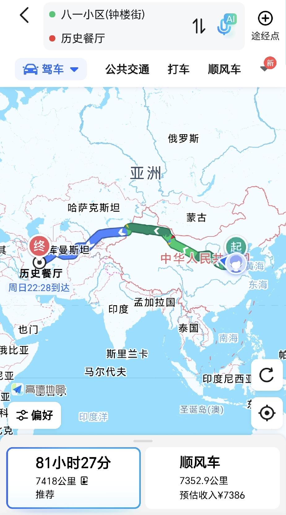 今天打开导航,看看从我们大山东到德黑兰需要多久,一看还真可以导航,全程需要7418公里,时间需要81个多小时,竟然还有顺风车,[捂脸]