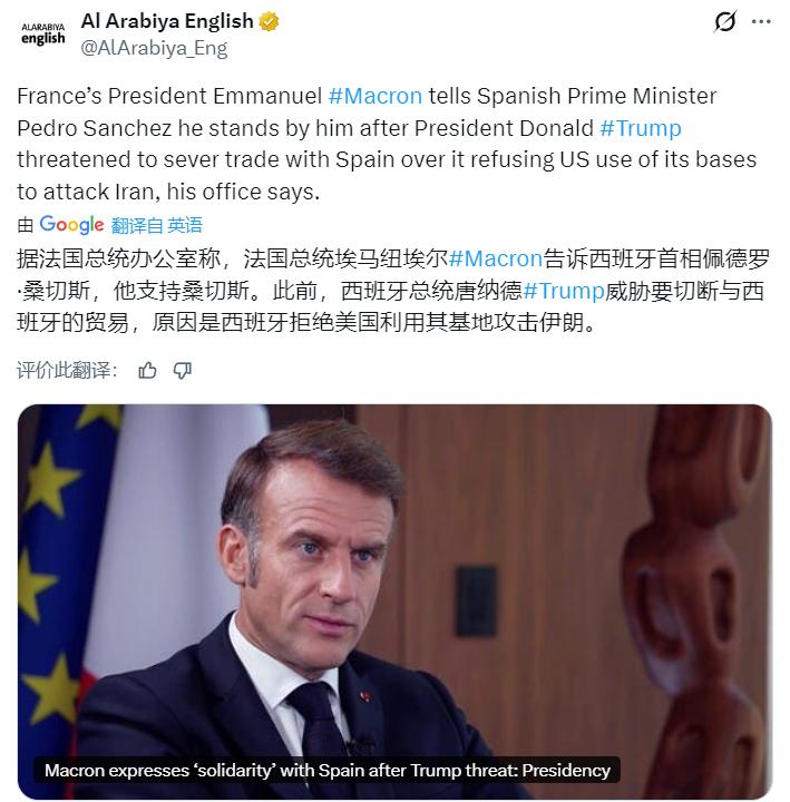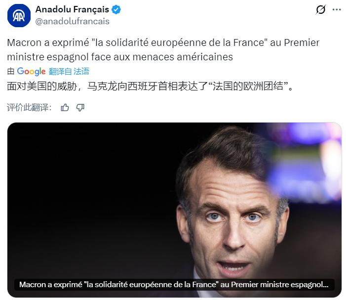 快讯!据多家媒体消息:法国总统马克龙向西班牙首相桑切斯表示,在美国发出经济威胁后,法国支持西班牙,并展现欧洲团结。 说白了,马克龙的表态,看似是简单的盟友互助,实则是对美国经济威胁的直接反击,更是欧洲国家寻求团结、摆脱美国束缚的明确信号。毕竟,美国动辄用经济手段施压欧洲盟友,早已让不少国家心生不满。 先把事情说清楚,美国近期对西班牙发出的经济威胁,并非无的放矢。事实上,西班牙近期在能源合作、对俄政策上坚持自身立场,没有完全迎合美国的要求,这才招致了美国的施压。 而美国的惯用手段就是以贸易制裁、关税加征相威胁,试图逼迫欧洲盟友服从自己的战略安排,这次针对西班牙,本质上也是想杀鸡儆猴,震慑其他有独立想法的欧洲国家。 事实上,马克龙此时站出来力挺桑切斯,明确表示法国支持西班牙,可不是一时兴起。要知道,法国作为欧盟的核心成员国,一直主张欧洲独立自主,早就对美国的霸权施压感到不满。 话锋一转,马克龙强调的“欧洲团结”,看似是一句口号,实则有着实实在在的考量。欧洲各国地缘相近、经济相连,一旦有国家被美国单独施压,其他国家也难免会受到波及,唇亡齿寒的道理大家都懂。 如果西班牙在美國的施压下妥协,美国只会得寸进尺,后续还会向其他欧洲国家提出更多不合理要求,到时候整个欧洲都会被美国牢牢捆绑,失去自主发展的空间。 事情还不止如此,更值得注意的是,马克龙的表态,也反映出欧洲与美国之间的裂痕正在不断扩大。近年来,美国频频推行单边主义政策,不顾欧洲盟友的利益,让双方的矛盾越来越深。 最明显的就是之前的能源危机,美国为了自身利益,限制欧洲与俄罗斯的能源合作,导致欧洲能源价格暴涨,经济遭受重创,不少欧洲国家对美国的不满已经积累到了顶点。 其实马克龙的支持,不仅是在帮西班牙,也是在帮整个欧洲。他想通过这种方式传递一个信号:欧洲国家应该团结起来,共同抵制美国的不合理施压,不能再任由美国摆布。 抛开表面看,这里头其实还藏着欧洲追求独立自主的决心。长期以来,欧洲一直被美国视为“附庸”,在外交、军事上处处受美国牵制,而这次马克龙的表态,正是欧洲觉醒的一个缩影。 事实上,类似的团结表态在欧洲并不是个例,之前德国也曾在贸易问题上与法国并肩,共同反对美国的关税施压,只是这次马克龙的表态,针对性更强,也更具代表性。 说实话,美国得知马克龙的表态后,大概率会加大对欧洲的施压,试图破坏欧洲的团结。毕竟,欧洲一旦真正团结起来,就会成为一股不可忽视的力量,直接削弱美国在欧洲的影响力。 未来,欧洲能否真正实现团结,抵御美国的施压,还是个未知数。毕竟,欧洲内部也存在分歧,有些国家依然倾向于依附美国,不敢公开与美国对抗。 说到底,马克龙的这次表态,无疑给欧洲各国树立了一个榜样,也让更多欧洲人意识到,只有团结一心、坚持独立自主,才能真正维护自身的利益,才能在复杂的国际局势中站稳脚跟。 以上是小编个人看法,如果您也认同,麻烦点赞支持!有更好的见解也欢迎在评论区留言,方便大家一同探讨。