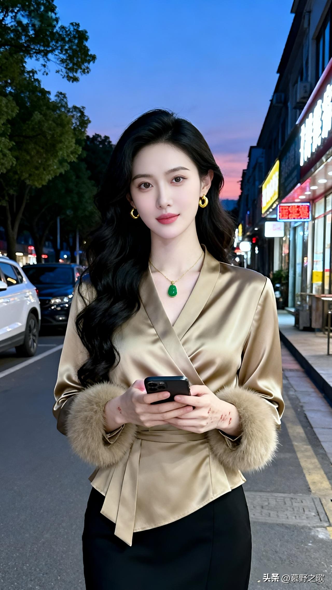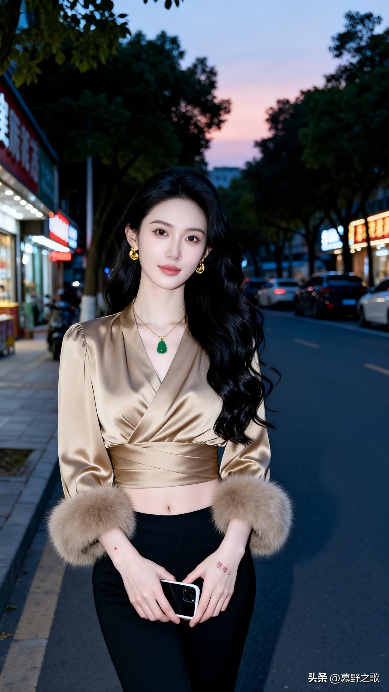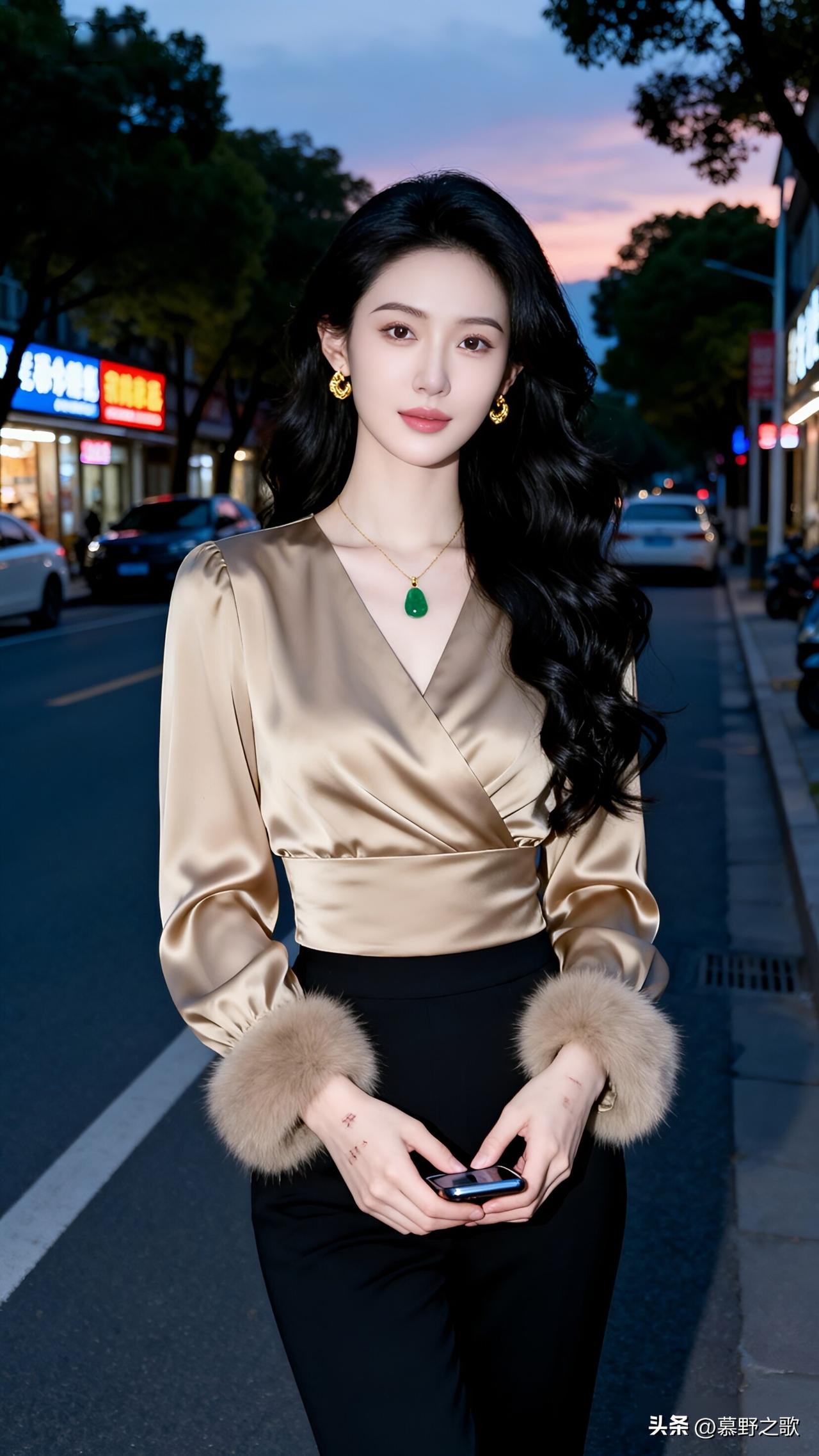 小姐姐走在黄昏的街头,穿了一件香槟金色缎面交叉上衣,袖口的毛绒装饰又暖又高级,下身配了黑色高腰裤,把腿衬得又细又长。她的长发微卷,耳饰和项链的绿色吊坠在光线下特别亮眼,整个人又美又飒,都市感直接拉满。 黄昏的粉紫色天空,和她的金缎上衣形成了绝美的对比,街灯的暖光洒在她身上,让她的眼神更显温柔又坚定,就像都市里独立又迷人的女主角,自信又耀眼。 美女人像群 都市穿搭 黄昏氛围感 又美又飒
