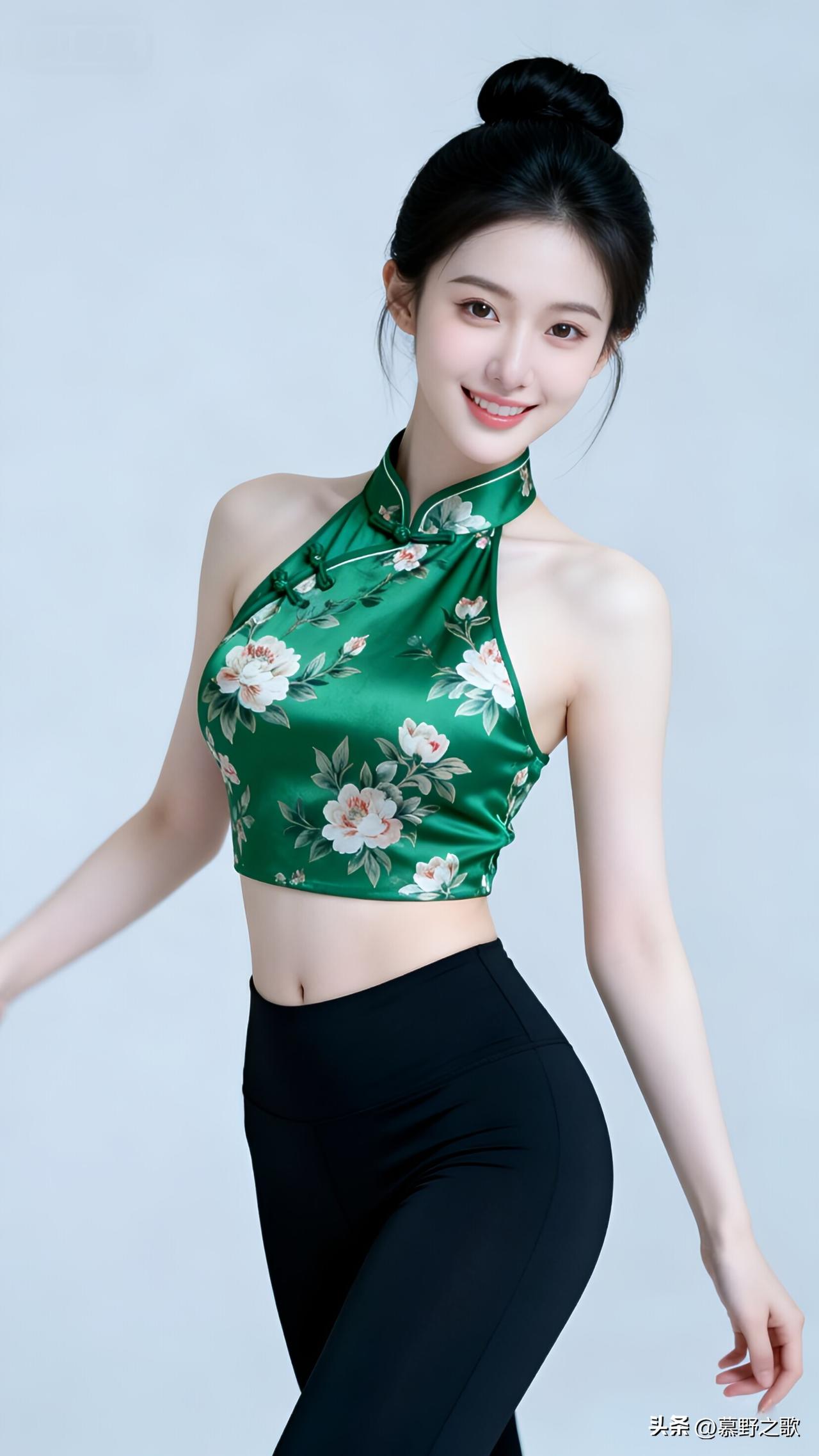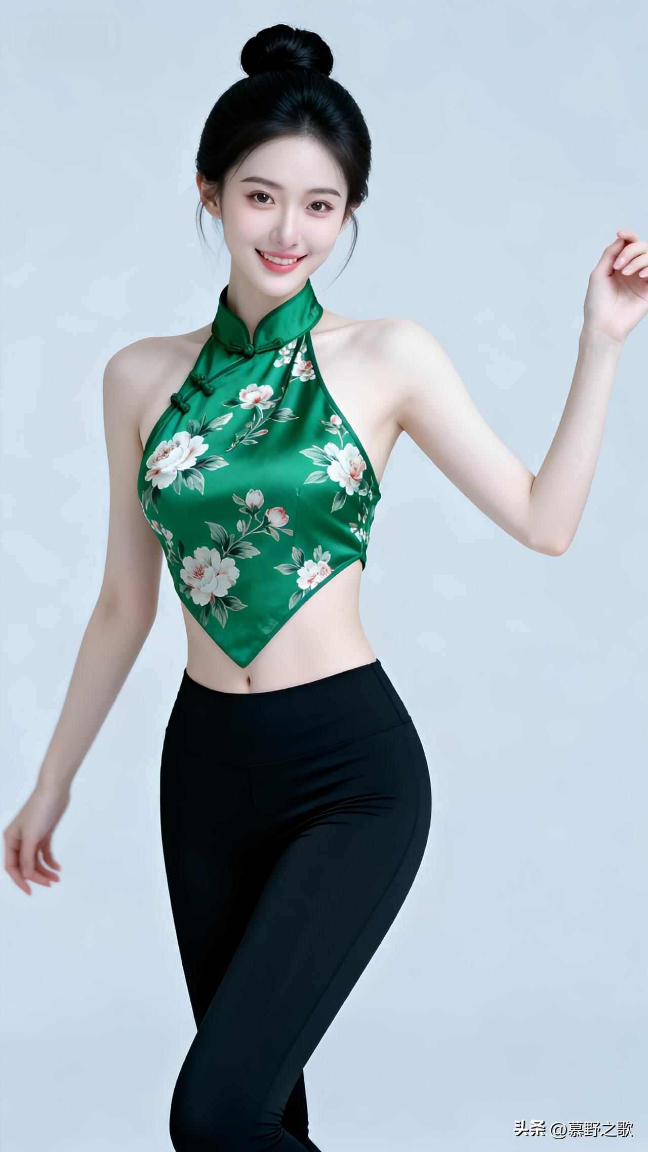 小姐姐穿了一件绿色缎面肚兜,上面印着淡雅的花,盘扣和立领都透着浓浓的中式韵味,下身配了黑色高腰瑜伽裤,把腰线和臀线都衬得特别好看。她的头发盘成了丸子头,笑容灿烂又自信,整个人又美又飒,新中式风格直接拉满! 这种把传统肚兜穿出时尚感的能力,真的太让人羡慕了!打破了中式服饰的刻板印象,既保留了东方韵味,又不失现代活力,又纯又欲,爱了爱了! 美女人像群 新中式穿搭 肚兜 又美又飒