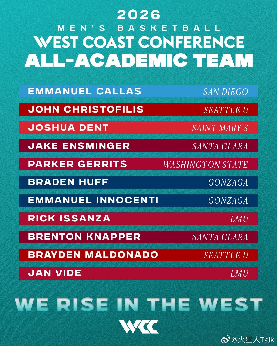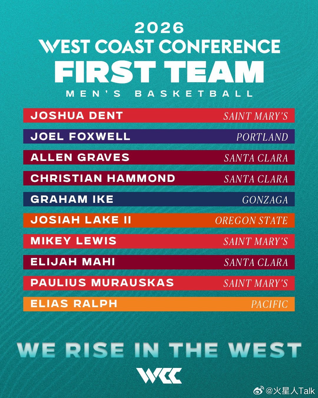 NCAA男篮 2025-2026赛季WCC联盟常规赛表现奖和最佳阵容。 最佳球员:Graham Ike。最佳防守球员:Will Heimbrodt。最佳第六人:Allen Graves。最佳新人:David Fuchs。最佳新生:Allen Graves最佳教练:Herb Sendek。