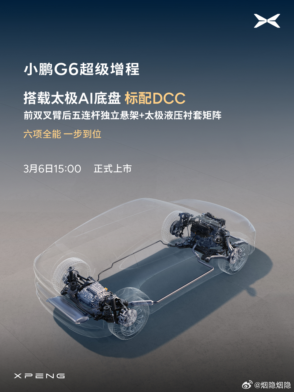 【快速发布换代车型,实现一车双能布局】G6超级增程,正式定档3月6日15:00发布。烟隐路边社预计三四月小鹏还有两款换代车型发布,快速完成布局。“六项全能,一步到位”的小鹏G6超级增程,把家用SUV该有的样子做足了:1️⃣全球综合续航最长,CLTC综合续航1704km、纯电430km,日常远行都兼顾;2️⃣同级唯一800V+5C超充,12分钟完成10%到80%补能;3️⃣2250TOPS算力加持第二代VLA智驾,像个默契老司机;4️⃣85.6%同级最大得房率,前后排头部、腿部空间全面领先,全家人坐都宽敞;5️⃣标配一体式铝压铸车身,同级首个180km/h爆胎稳行、130km/h AEB刹停、冰雪AES刹停;6️⃣太极AI底盘标配前双叉臂/后五连杆、DCC可变阻尼和液压衬套矩阵,毫秒级预瞄,让百万级驾控质感成为日常。1704km超长续航,没有任何里程能束缚你的脚步,也不必为下一个充电桩在何处而焦虑。“青春没有售价,G6带你一脚直达拉萨”,该有的都有了,敬请期待价格。