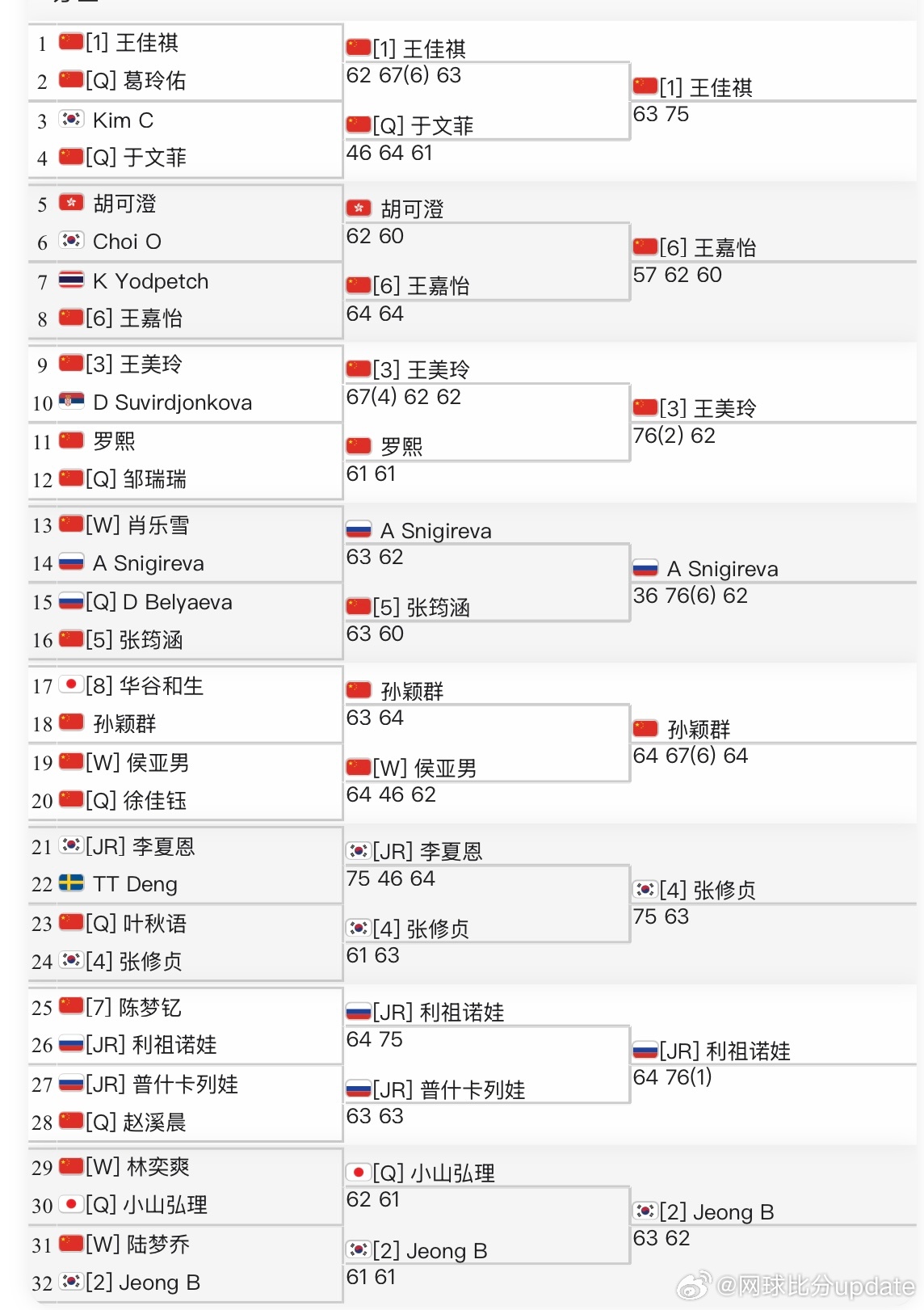 🇨🇳马鞍山W15女单第二轮🇨🇳王美玲7-6/6-2 🇨🇳罗熙🇨🇳王嘉怡5-7/6-2/6-0 🇭🇰胡可澄🇨🇳孙颖群6-3/6-7/6-4 🇨🇳侯亚男[WC]🇨🇳张筠涵6-3/6-7/3-6 🇷🇺Snigireva