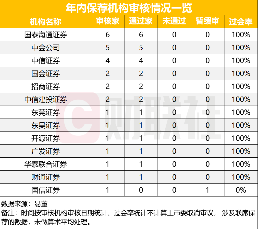 另一个值得关注的是,整体上看,各家保荐机构的过会率整体较高,12家收获过会项目的券商均保持100%的过会率,仅有国信证券的1个项目暂缓审议。