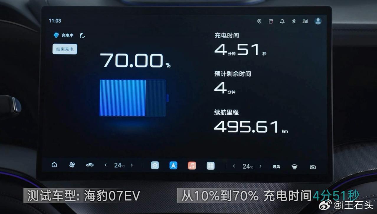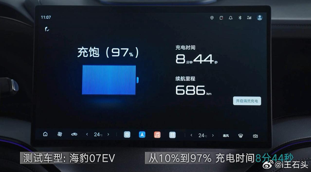 全球量产最快充电速度 10%到70%只要5分钟 10%到97%只要9分钟 测试车型是海豹07EV 5分钟充好,9分钟充饱