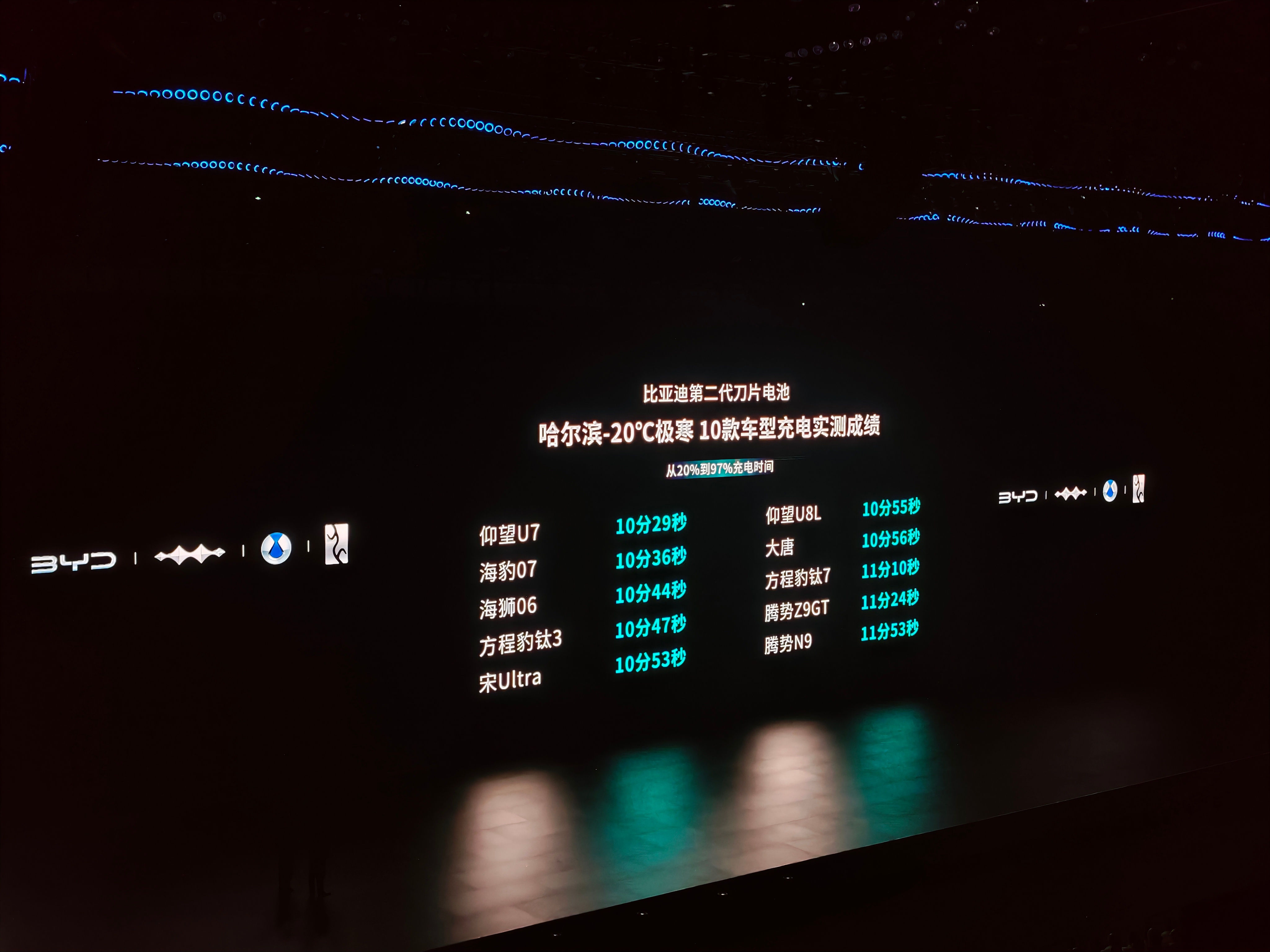 零下20度,比亚迪10款车,从十几万到100万,10-97%,充电时间全部在12分钟以内,零下30度也能做到12分钟左右,这下电车真能过山海关了。比亚迪今晚发布二代刀片及闪充 比亚迪第二代刀片电池