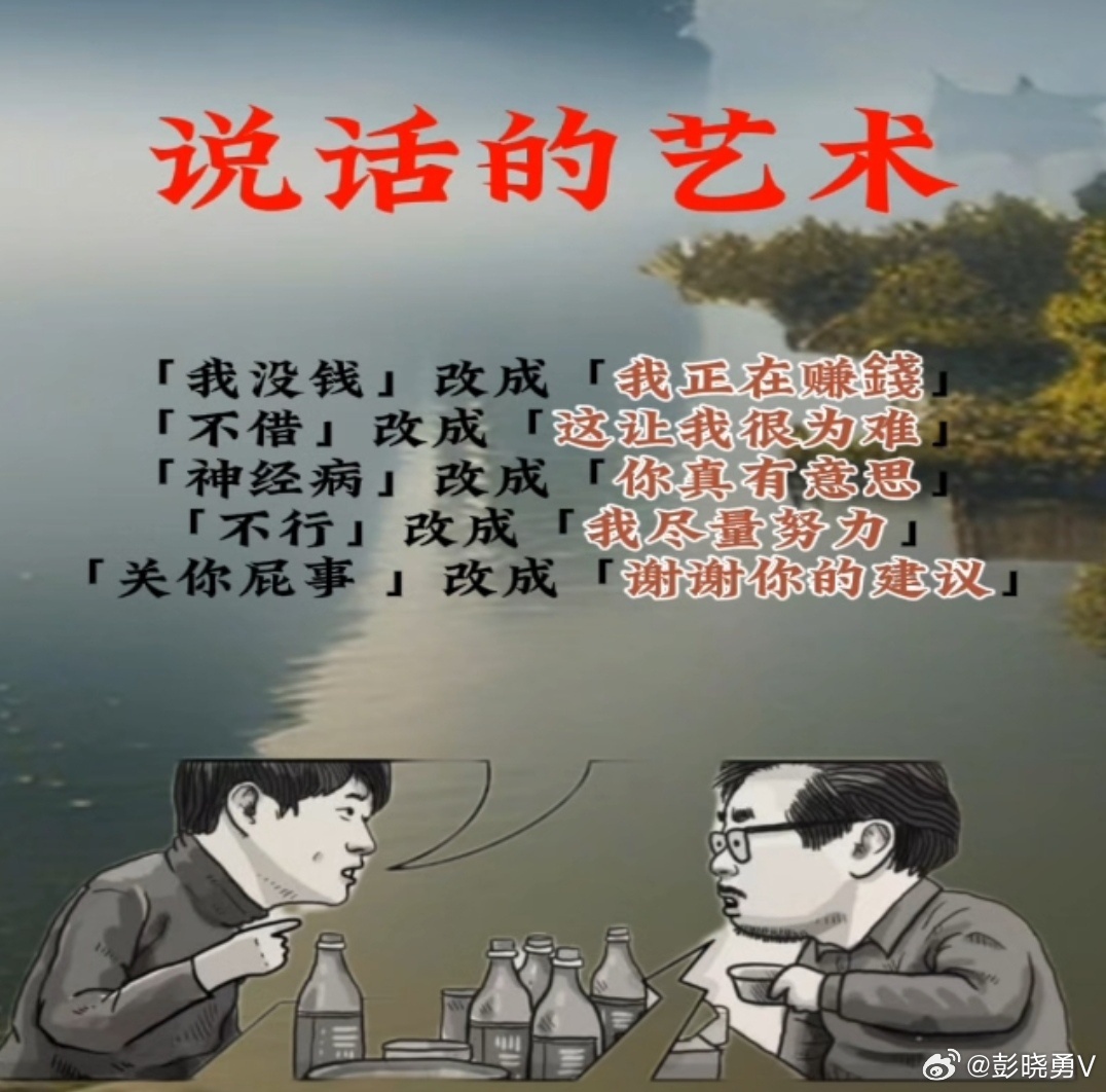 彭晓勇分享《说话的艺术》说话别嚷,小声说,小声更让人舒服。说话别急,想着说,想着说不会出错惹祸。说话别直,拐弯说,拐弯说别人更容易接受。说话别贬,捧着说,捧着说人人都爱听。说话别杠,商量说,商量就是不直接驳斥。说话别抢,让人说,就是不打断或者抢别人的话。到达以上70%你就很棒加油💪💪💪