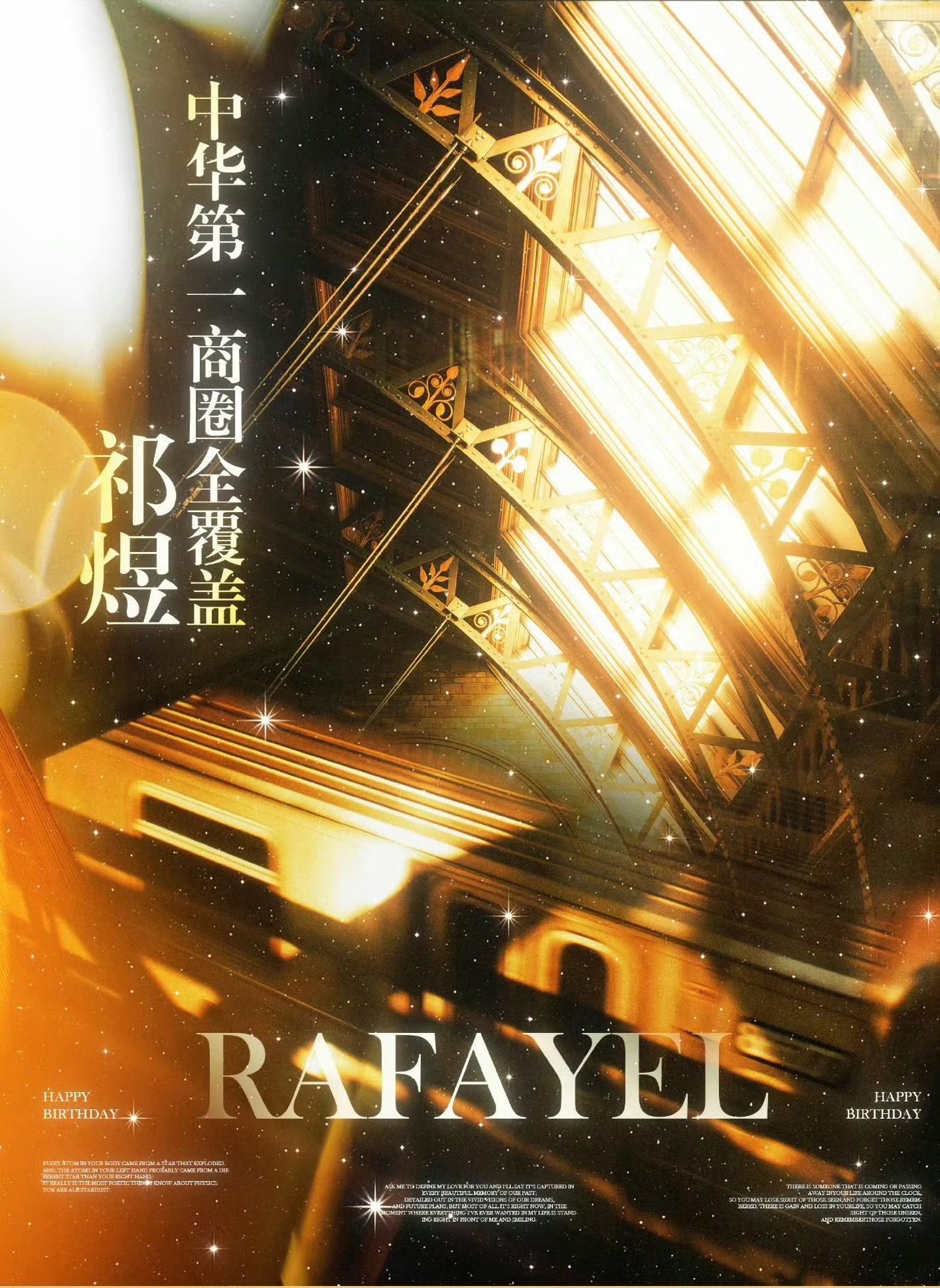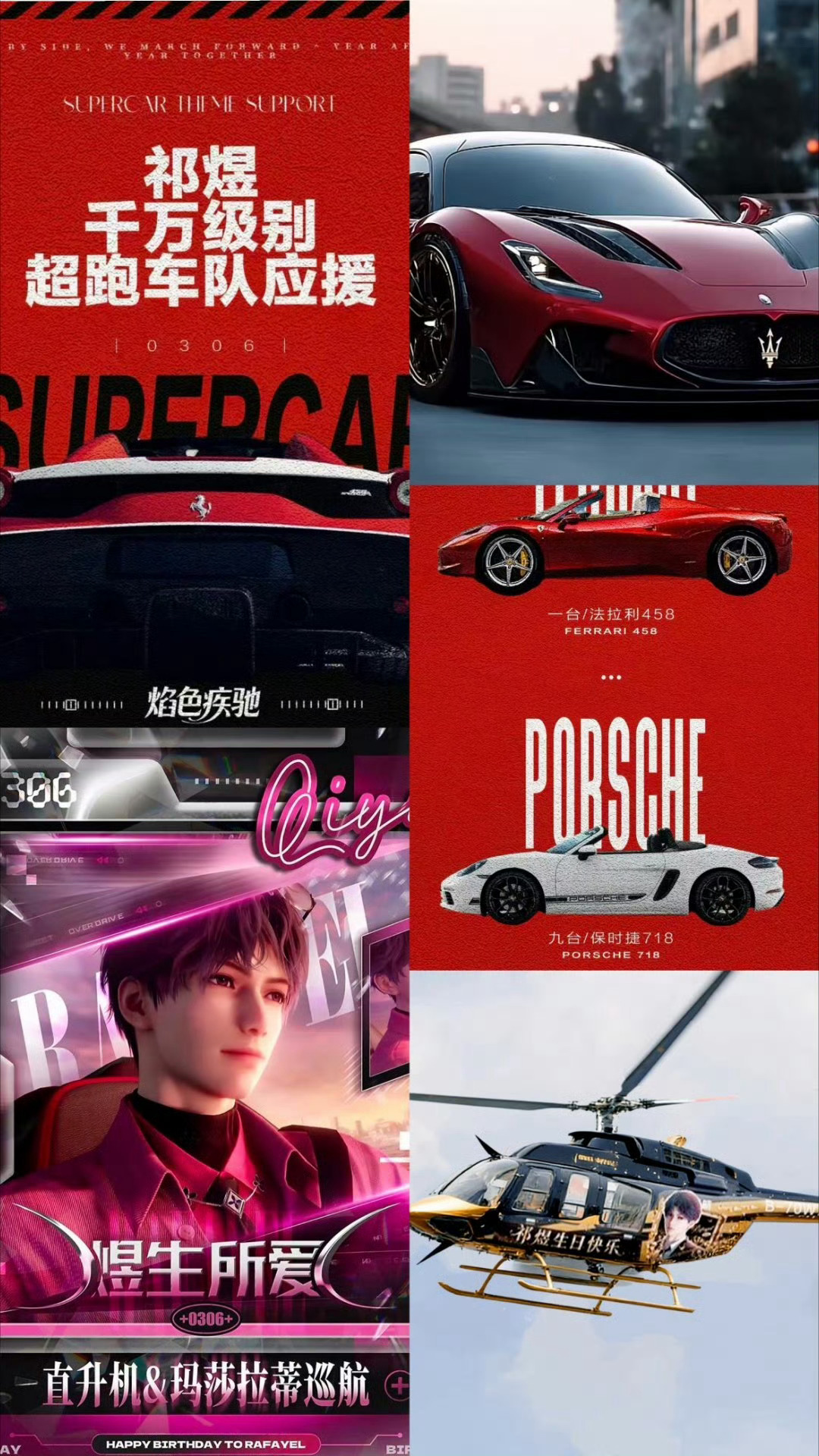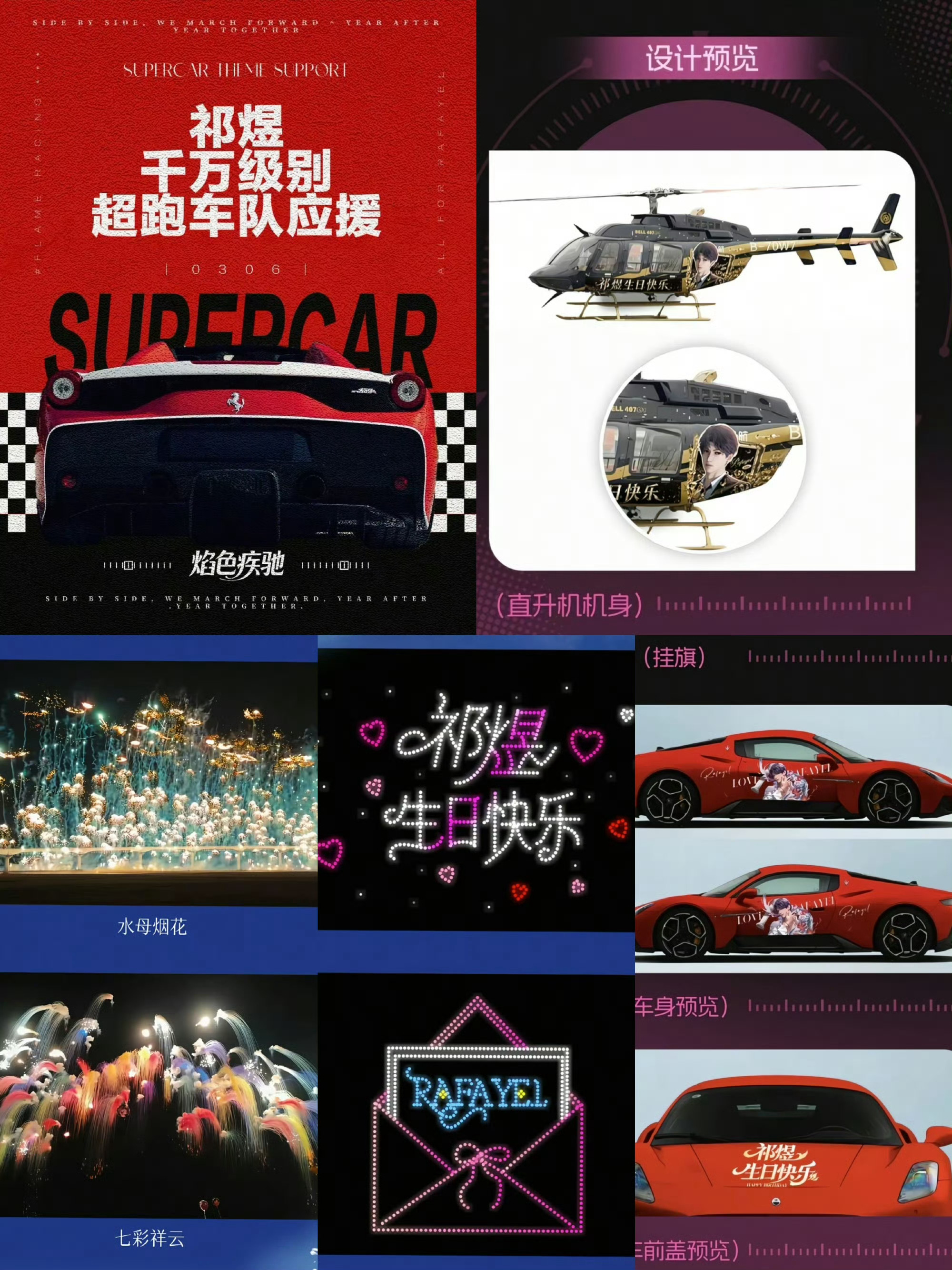 祁煜直升机玛莎拉蒂巡航每天就这样睁大眼睛张大嘴巴的看着生贺组发的应援。一分钟w起步的灯光秀,千万级跑车车队,无人机,直升机,定制烟花秀,痛铁,非遗,痛湾.....停停停,我都列不完了而且每个应援都普及到全国各个地区每天都是还没从上一个发的应援缓过来,下一秒又来一个,每天都在被生贺组震惊到。越到后面越重量级的应援越多。生贺组发不完,鱼推看不完。