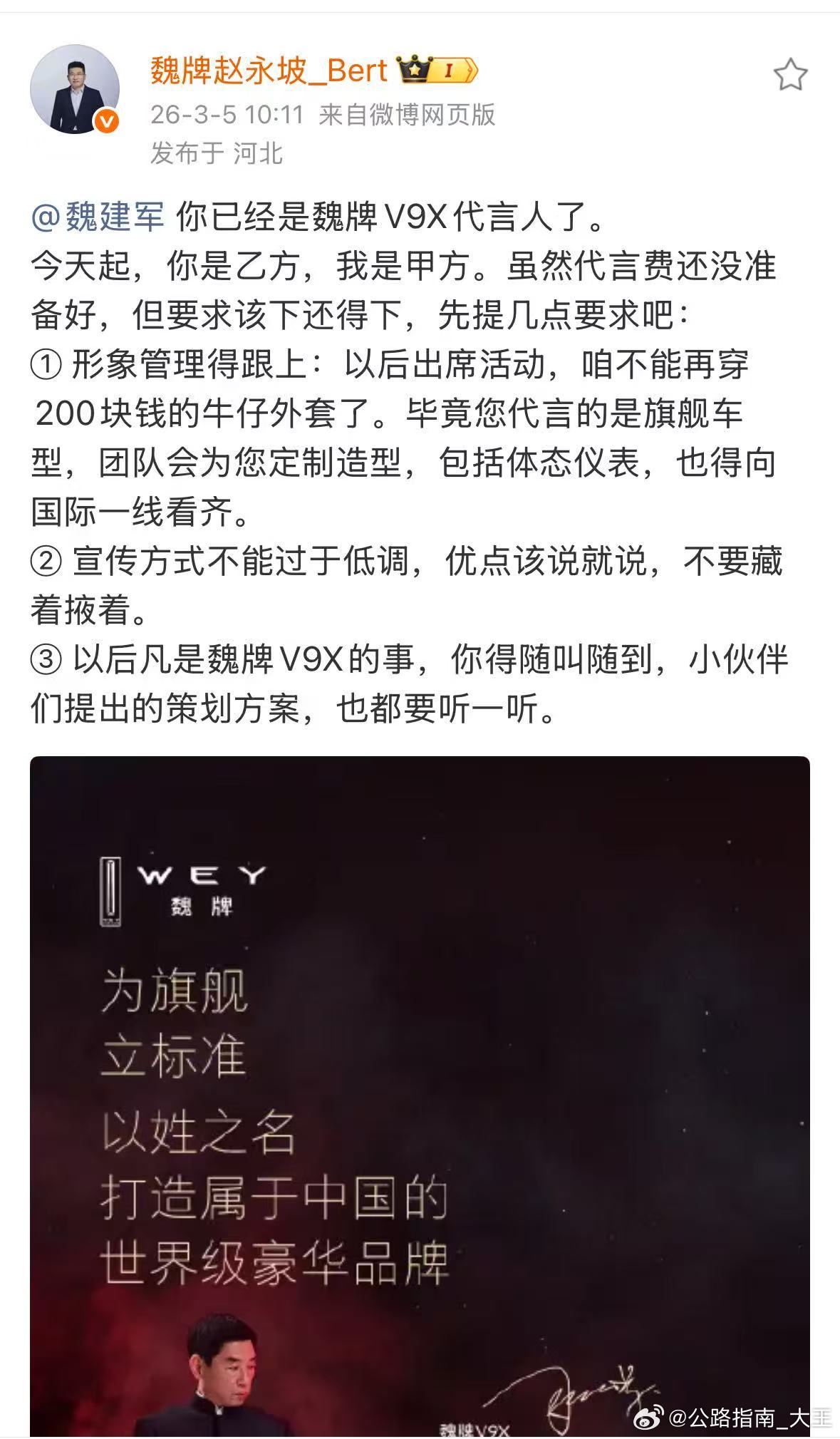 魏牌的赵总,对新的代言人,提出了品牌要求,但貌似有点“不认可”魏建军下场为魏牌V9X代言大v聊车