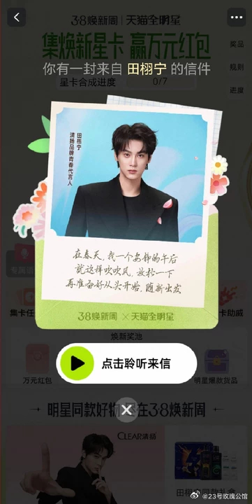 田栩宁天猫全明星春日来新 谁被田栩宁的春日语音来信甜到啦!上淘宝搜田栩宁,一键收听专属语音,还能集卡咕卡抽好礼,春日惊喜拉满~天猫全明星计划