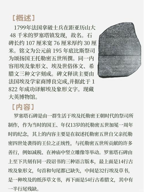 一块石头,破解失落文明:罗塞塔石碑为何如此重要? 很多人以为,罗塞塔石碑上刻着什么神秘预言,或者隐藏着古埃及的终极秘密。 其实真相很“接地气”。 这块世界级文物,本质上只是一份——政府公告。 1799年,法国军队在埃及一座城市修建防御工事时,意外挖出了一块黑色石碑。谁也没想到,这块石头后来会成为破解古埃及文明的“钥匙”。 石碑上刻的内容其实并不复杂。 它记录的是公元前196年,一份为托勒密五世国王加冕发布的法令。简单来说,就是宣布一些政治决定:减免部分税收、赦免某些罪犯、奖励神庙和祭司,同时表扬国王平定叛乱、治理国家有功。 祭司们为了表达忠诚,还决定在各个神庙里竖立国王的雕像,加强对他的崇拜。 换句话说,这是一份典型的“官方宣传文件”。 那为什么一块普通石碑会震动整个历史学界? 关键就在于——语言。 同一段内容,石碑上用了三种文字刻写:古埃及象形文字、埃及草书,以及古希腊语。 古希腊语当时学者早就能读懂,但象形文字却已经失传了上千年。欧洲学界一直想破解它,却始终找不到突破口。 而罗塞塔石碑恰好提供了一把“对照钥匙”。 学者可以用已经读懂的希腊语内容,对比旁边的象形文字,一点点推断符号的含义。 经过多年研究,最终由法国学者沙普里奥成功破译。 从那一刻起,古埃及文明突然“开口说话”了。 神庙墙壁上的铭文、法老陵墓里的故事、几千年前的历史记录,都开始被人类重新读懂。 有意思的是,这块改变历史的石碑,本身差点被彻底遗忘。 它原本是更大石碑的一部分,后来神庙被毁,碎石被当作建筑材料使用。几百年里,它只是堡垒墙体里的一块普通石头。 直到1799年,它才重新被发现。 历史有时候就是这样:真正改变世界的钥匙,往往静静躺在角落里,等待被发现。