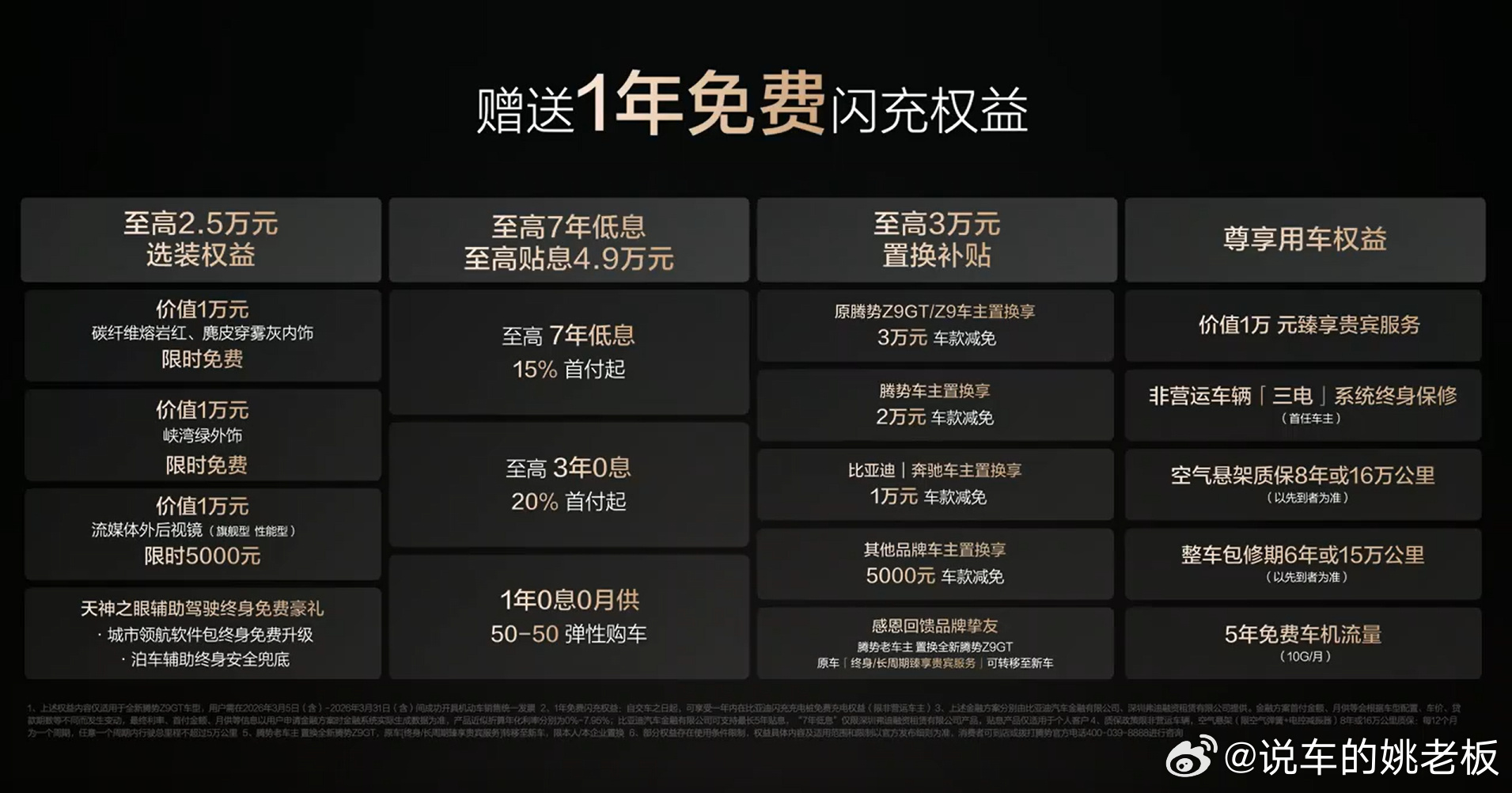 全新腾势Z9GT上市,售价26.98-36.98万元。新车推出单电机后驱版,CLTC纯电续航最高1036km,为全球纯电续航最长量产车型,大幅缓解里程焦虑。搭载比亚迪闪充技术,充电9分钟续航超千公里,补能效率拉满。车型兼顾运动操控与家用舒适,内饰豪华、智能配置齐全,长续航、快充、颜值与质感兼备,这样的新能源豪华GT,你会心动吗?腾势Z9GT充电9分钟续航超千公里
